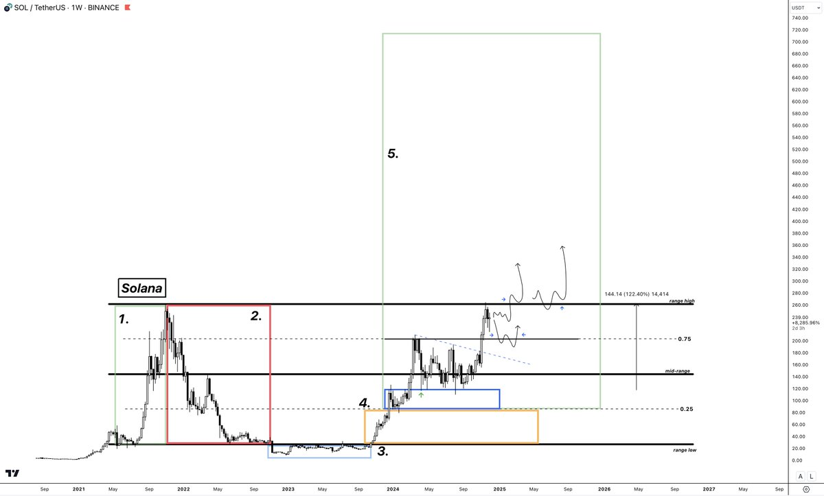 从市场周期的角度看,我预计 SOL 会突破当前的区间高位,并在价格进入「发现阶段」(即价格达到历史新高后,市场探索其真实价值)时有明显的上涨潜力。