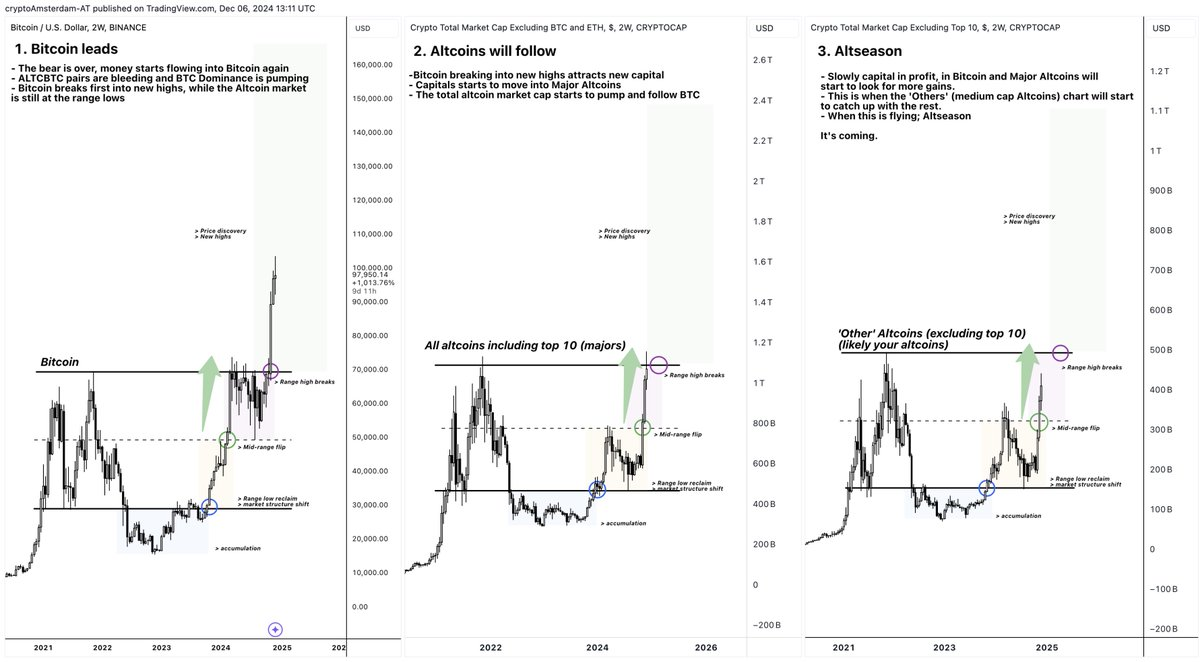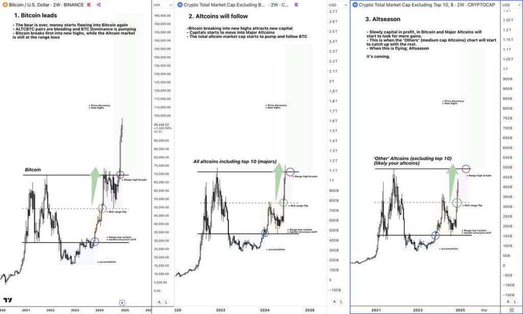 当比特币突破历史新高(即现在的阶段),资金𫔭始流向大市值山寨币。从 Total 3(前 100 名山寨币减去 BTC 和 ETH 的总市值)图表来看,虽然目前主要由大市值币种(如 XRP)推动,但中小市值币种的表现也在追赶。
