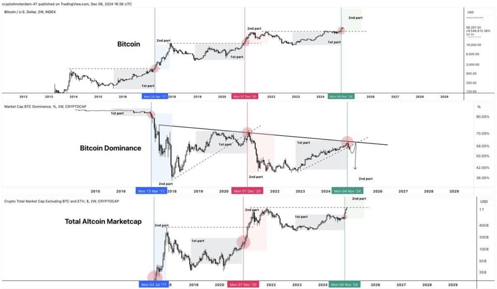 牛市的起点可以追溯到 2023 年底,当时比特币触底反弹,重新回到区间并上涨至前高,而山寨币对比特币贬值,比特币市场占比上升。