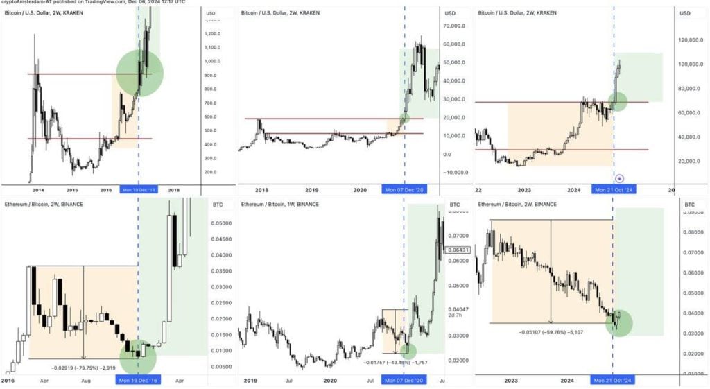 每个周期,以太坊在早期都会表现疲软(比特币上涨但仍低于前高),随后在比特币站稳前高上方时𫔭始反弹。