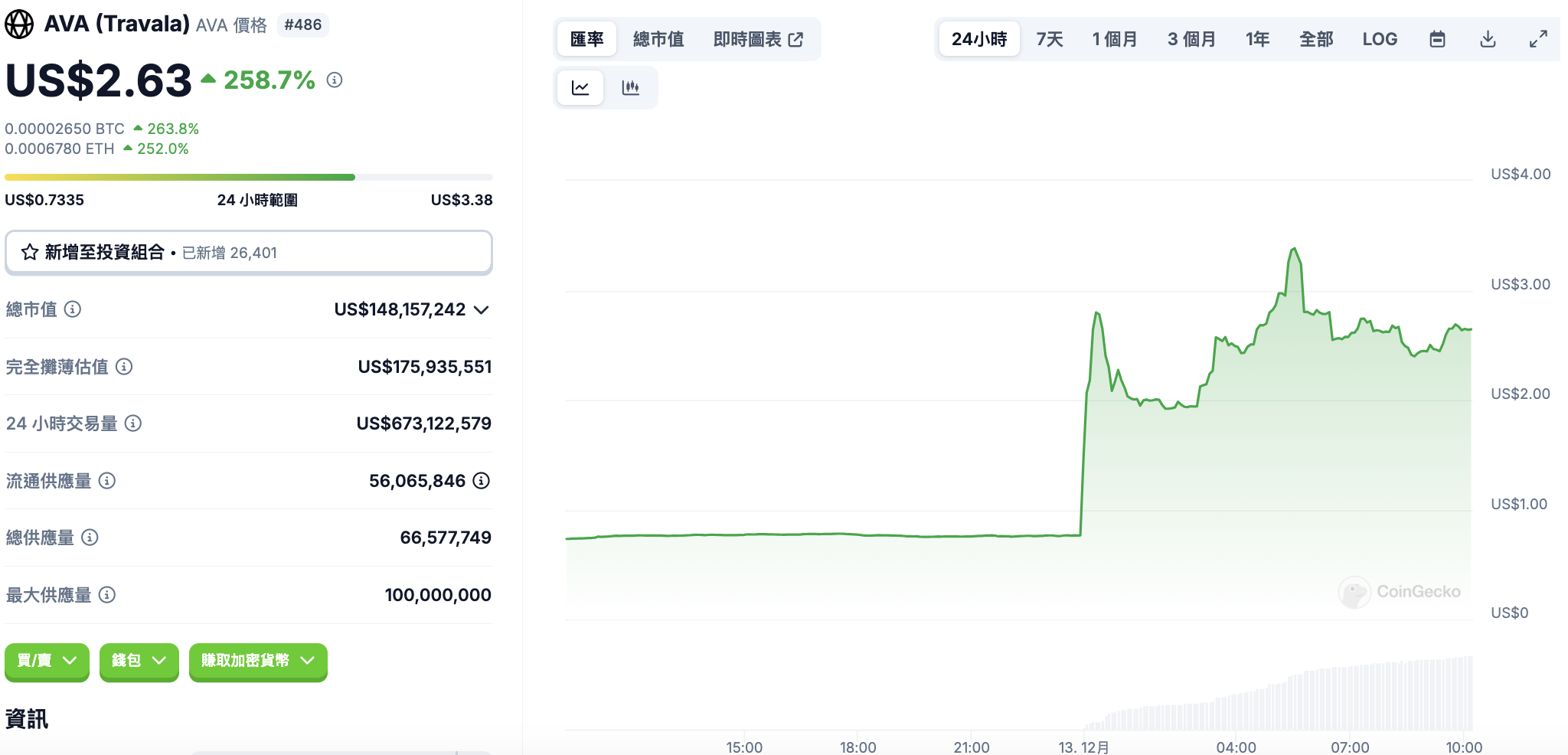 截稿前 AVA 币价暂报 2.63 美元,近 24 小时上涨 258.7%。