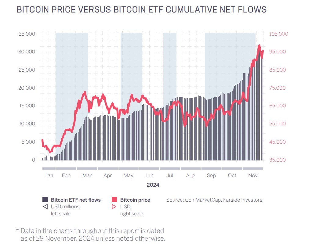 另外,全球首家数位资产银行 Sygnum Bank 近期还在其报告《加密货币市场展望》中 表示 ,机构对比特币的采用已经对 BTC 币价产生了乘数效应,当前每 10 亿美元现货 ETF 的资金净流入,就会推动比特币上涨约 3% 至 6%。