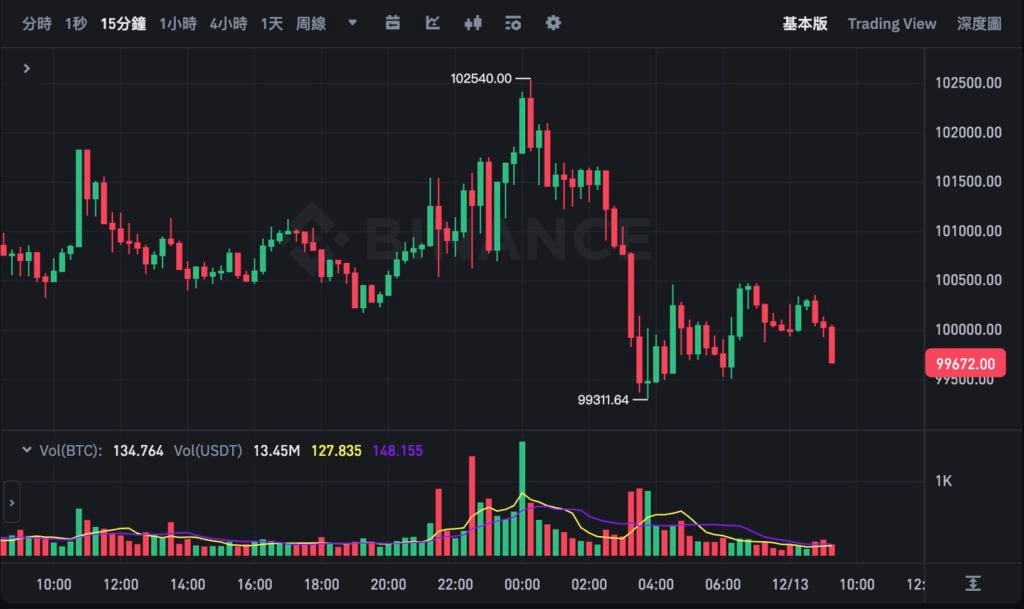 比 特币今(13)日午夜一度拉涨至 102,540 美元之后,随即迎来一波较大幅度的回调,稍早一度下探 99,311 美元。撰稿当下正在努力尝试站回十万美元之上,目前暂报 99,672 美元。