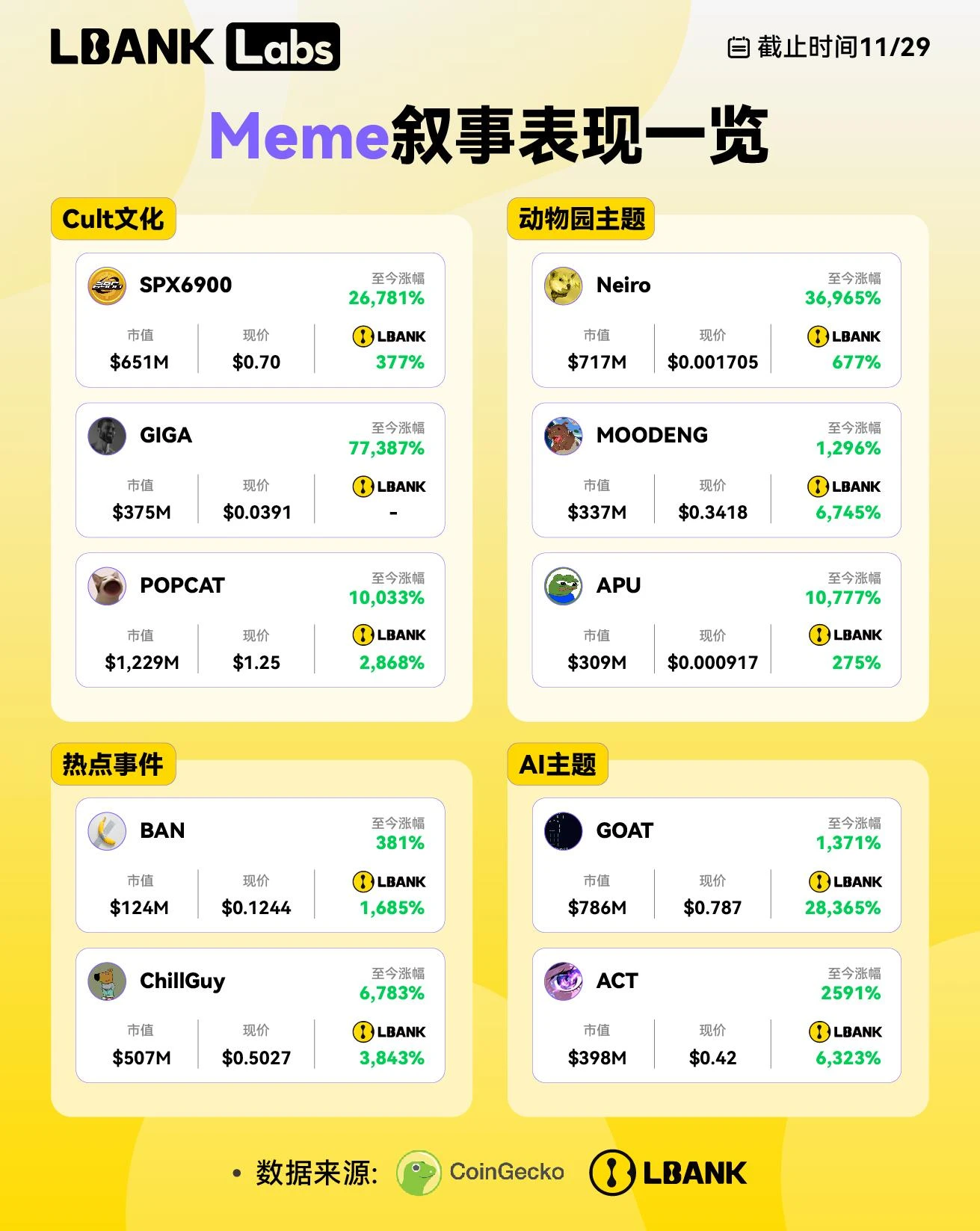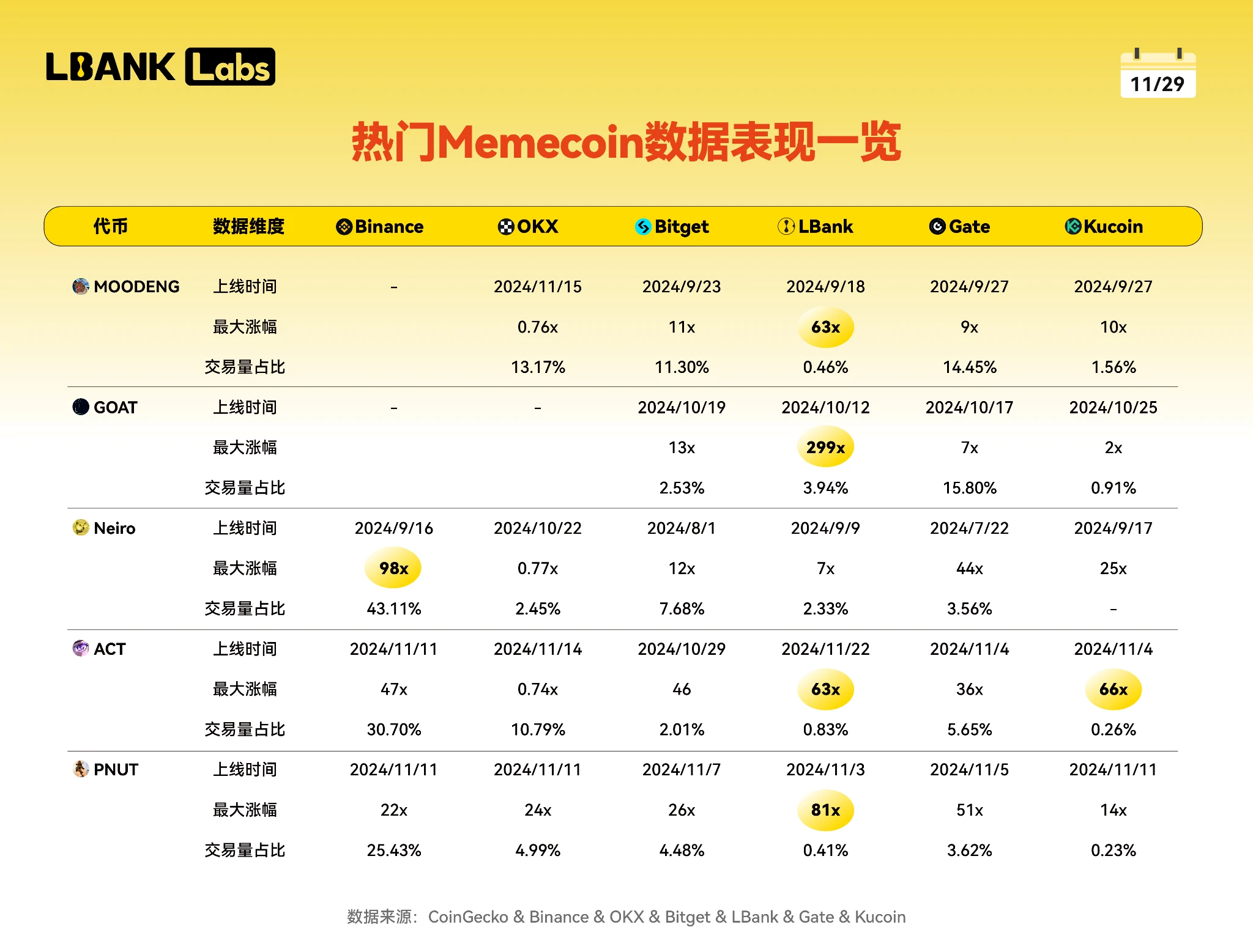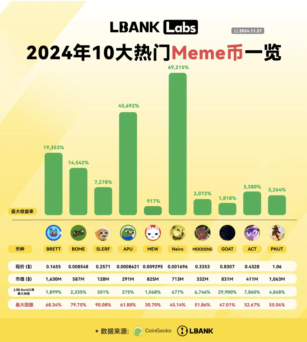 LBank 的成功不仅体现在数量上,更体现在质量上。其“ 2024 年十大热门 Meme 币报告”中列出的项目均在平台上线,覆盖率达 100% ,其中,GOAT、MOODENG 和 ACT 分别实现了 29, 900% 、 6, 746% 和 7, 860% 的惊人涨幅,这不仅为投资者创造了巨大价值,也凸显了 LBank 在早期识别和培育高潜力项目方面的独特优势。这种高命中率不仅是运气使然,更是 LBank 深入理解 Meme 币生态系统、精准把握市场脉搏的结果。