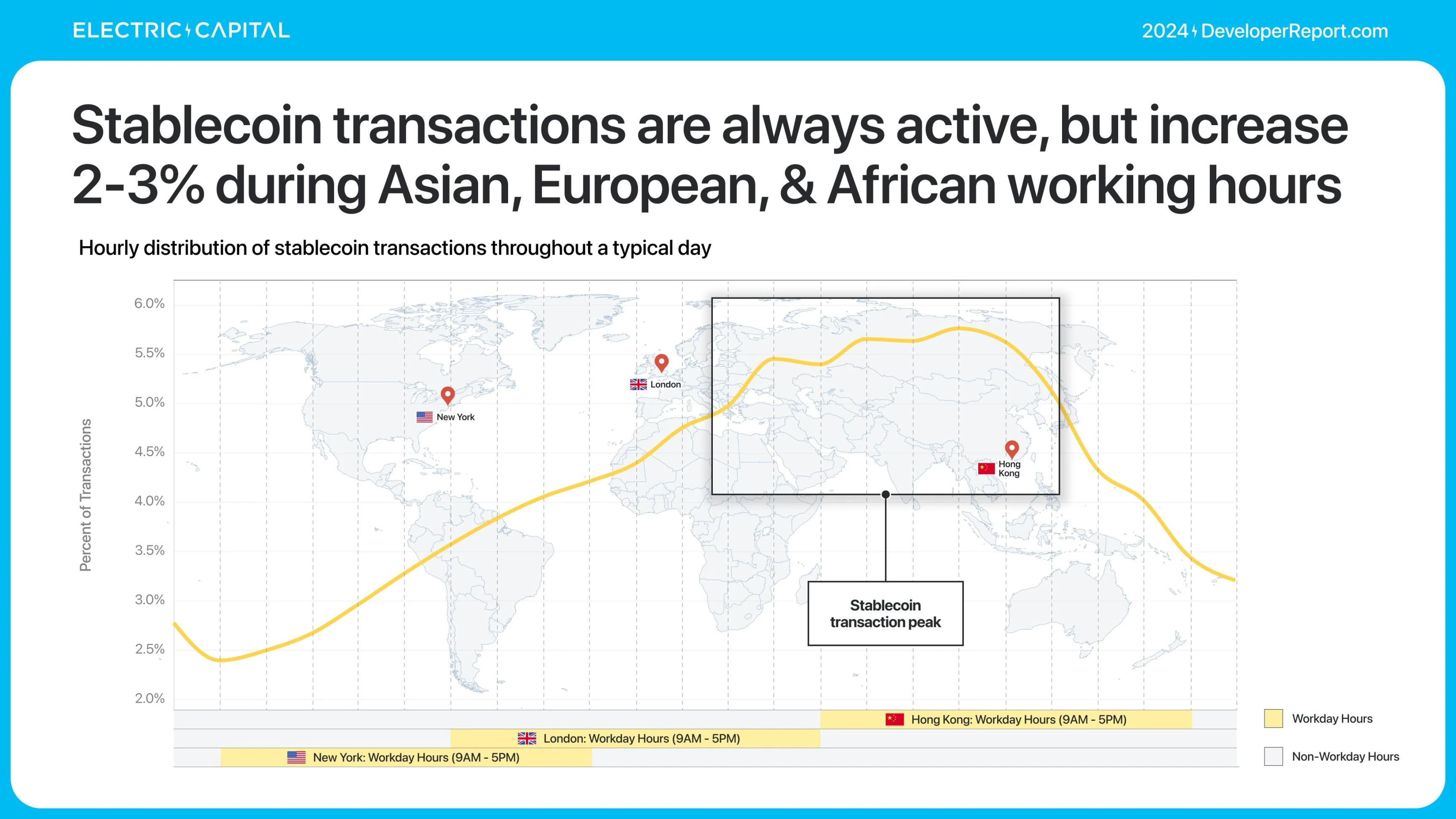 尽管稳定币交易在东半球的工作时间内达到峰值,但交易量更倾向于西半球。