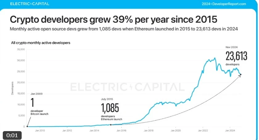 自 2015 年以太坊推出以来,加密行业以年均 39% 的速度增长。2015 年,每月活跃开发者约为 1, 000 人。如今:每月活跃开发者人数已增长至 23, 613 人。