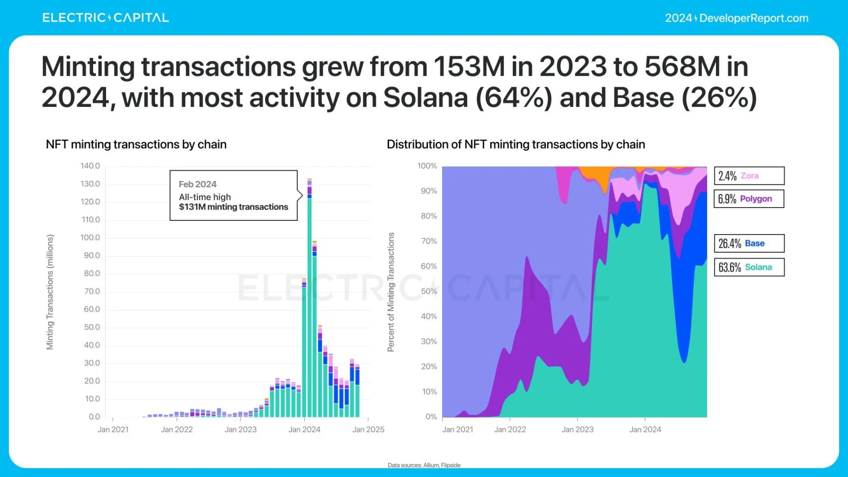 2024 年,NFT 铸造达到了历史新高, 97% 的铸造发生在 Base 上。