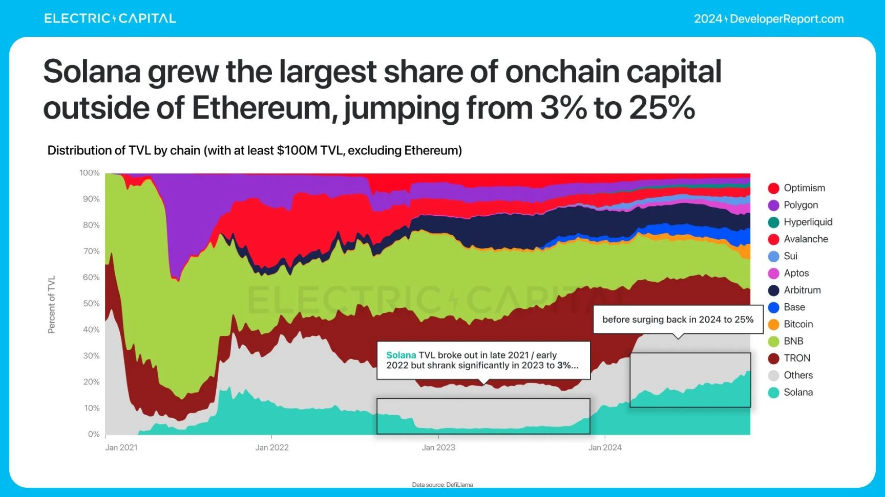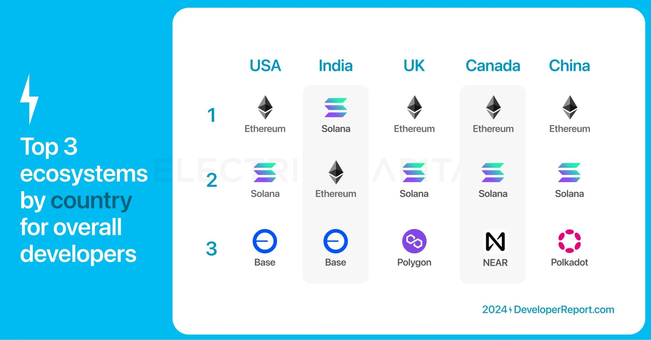 2024 年新开发者的总体情况:Solana 是新开发者最多的生态系统,排名第一。