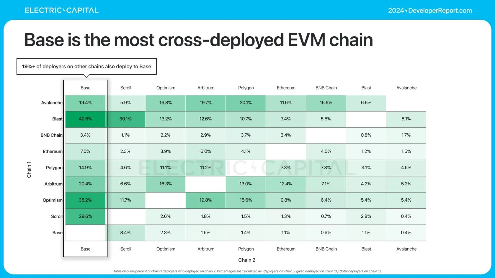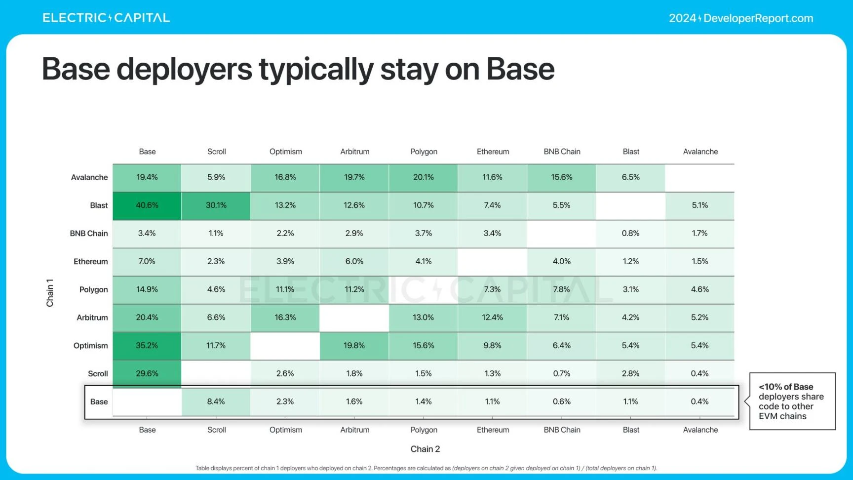 Base 是 2024 年 EVM 多链部署者最受欢迎的链,但 Base 的部署者倾向于留在 Base 链上。