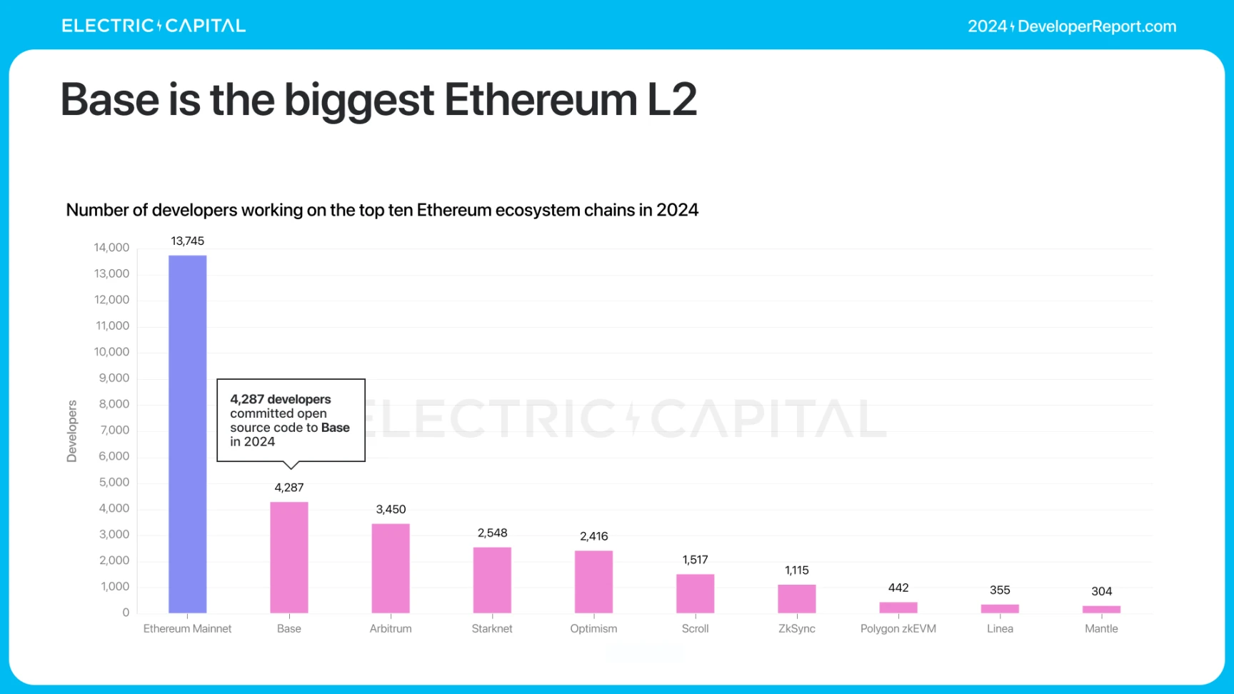 arbitrum、Starknet、Optimism 在 2024 年都拥有超过 2, 000 名开发者。