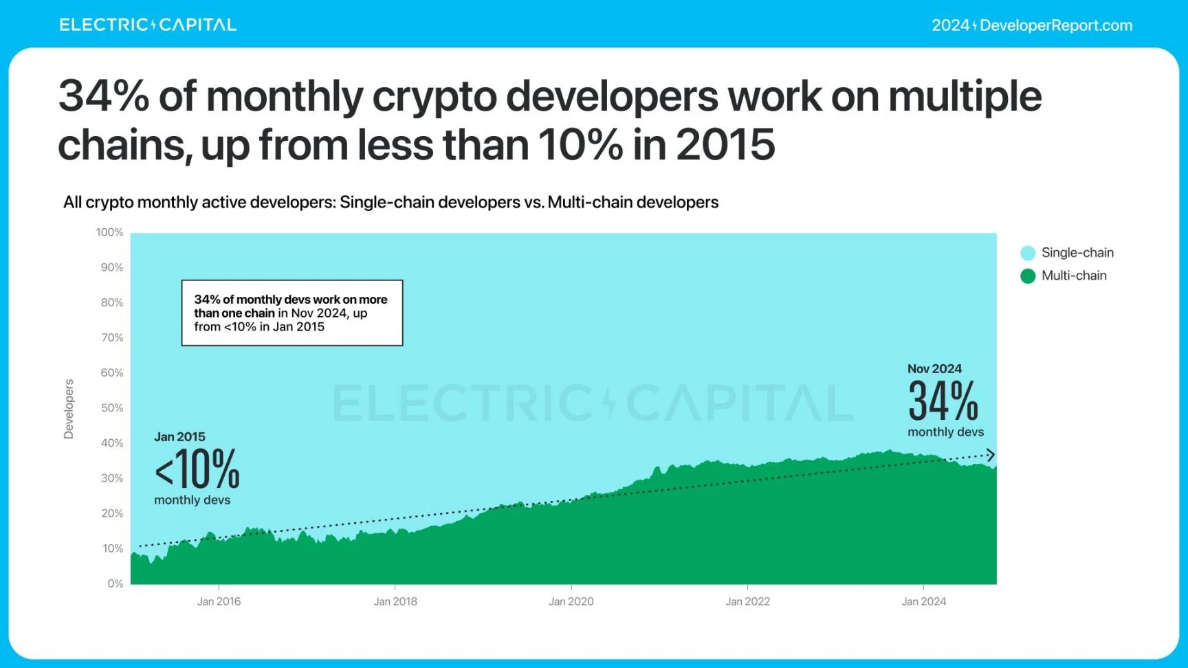 许多开发者活跃在多个链上——现在,每三位加密开发者中就有一位在多个链上工作,并且这一趋势在不断增长。每月活跃的多链开发者从 2015 年的不到 10% 增加到了 2024 年的 34% 。