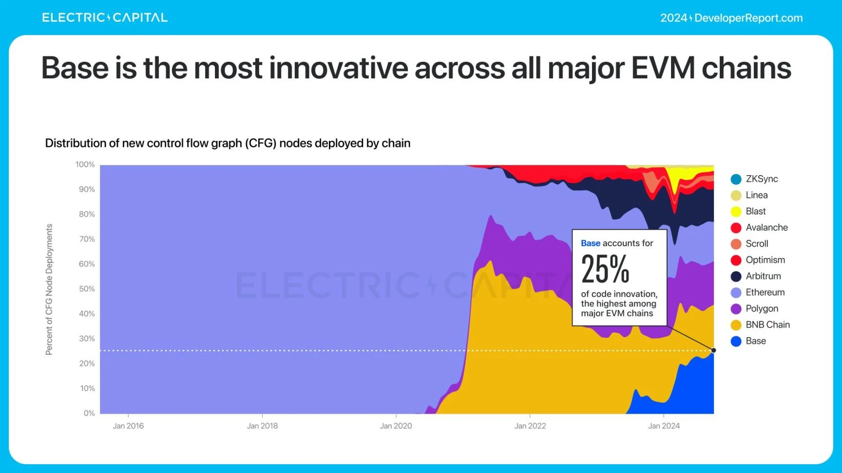 Base 现在占据了所有 EVM 链上原创链上代码逻辑的 25% ,是所有主要 EVM 链中最多的。