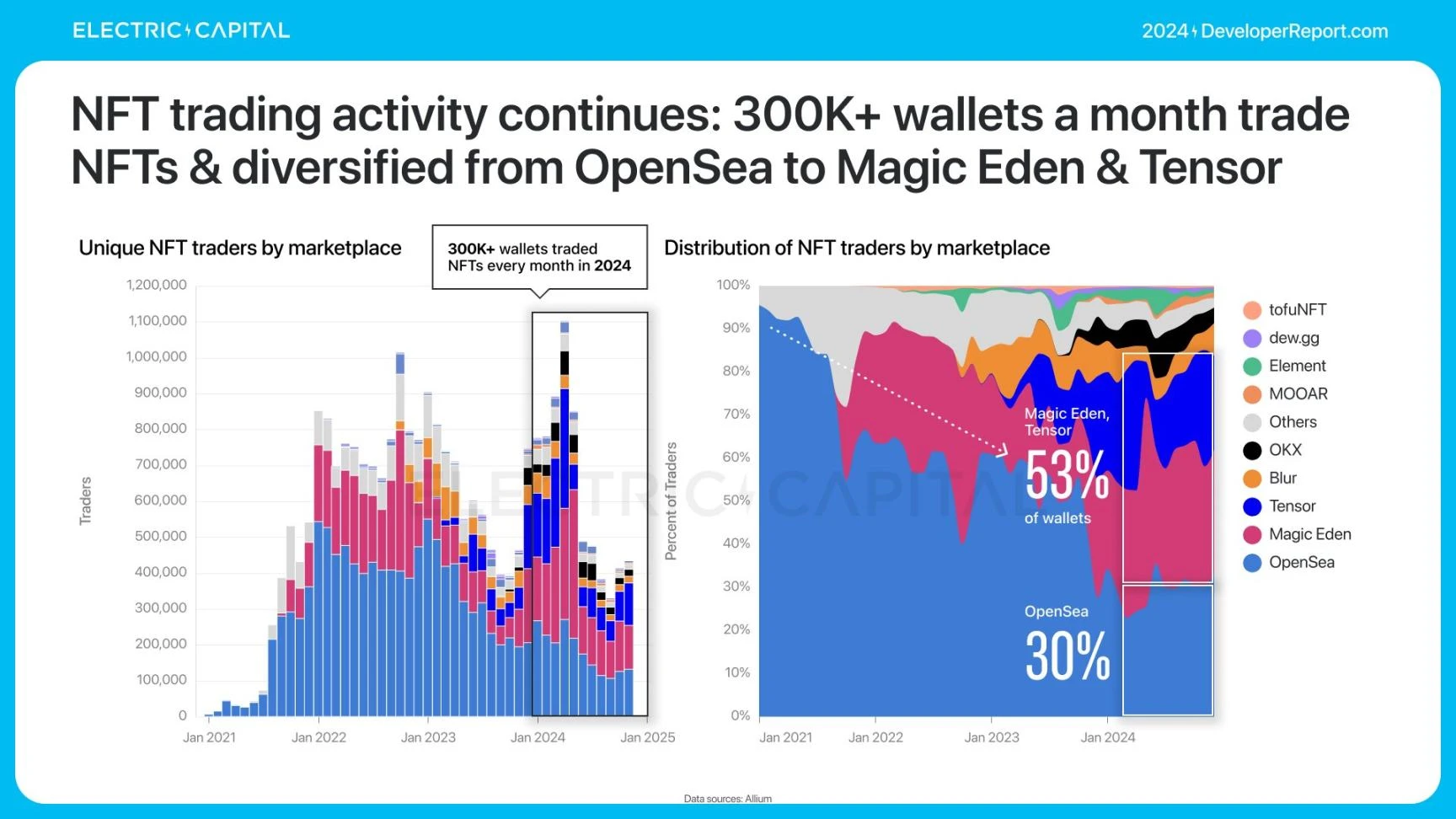 NFT 交易仍然是一个重要的基础应用,并且已经从 OpenSea 扩展到 Magic Eden 和 Tensor 等平台。