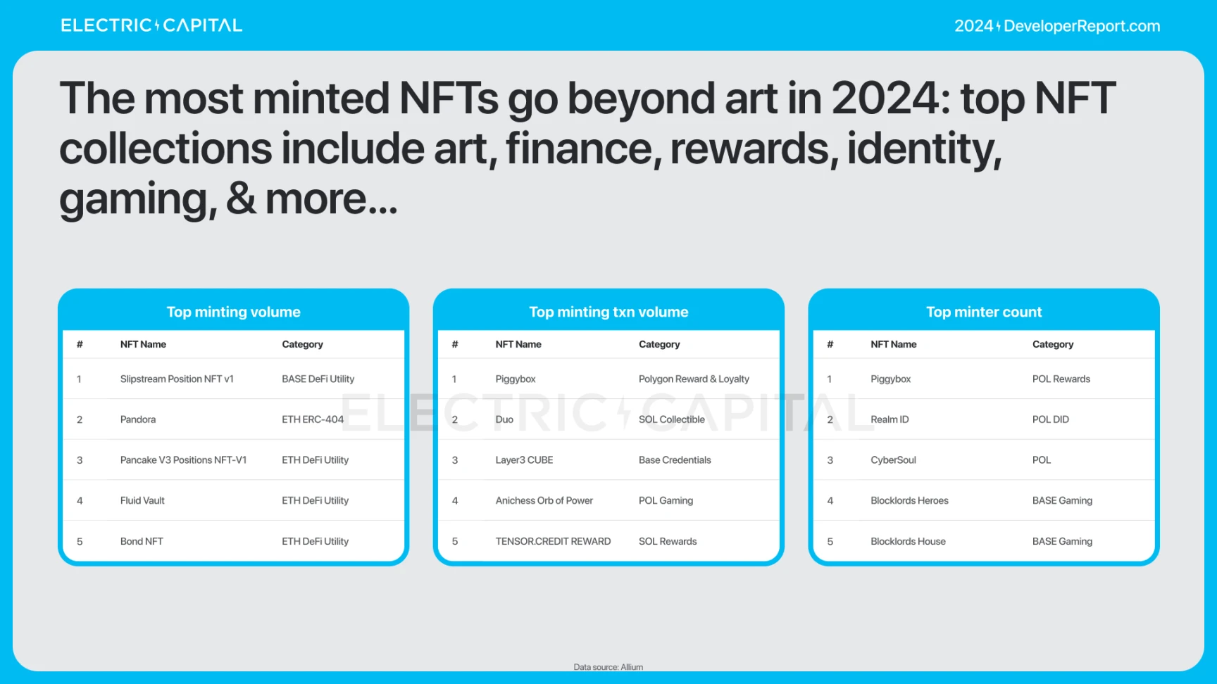 铸造活动的增加是因为 NFT 在 2024 年已经超越了艺术领域,涵盖了更多的应用场景。