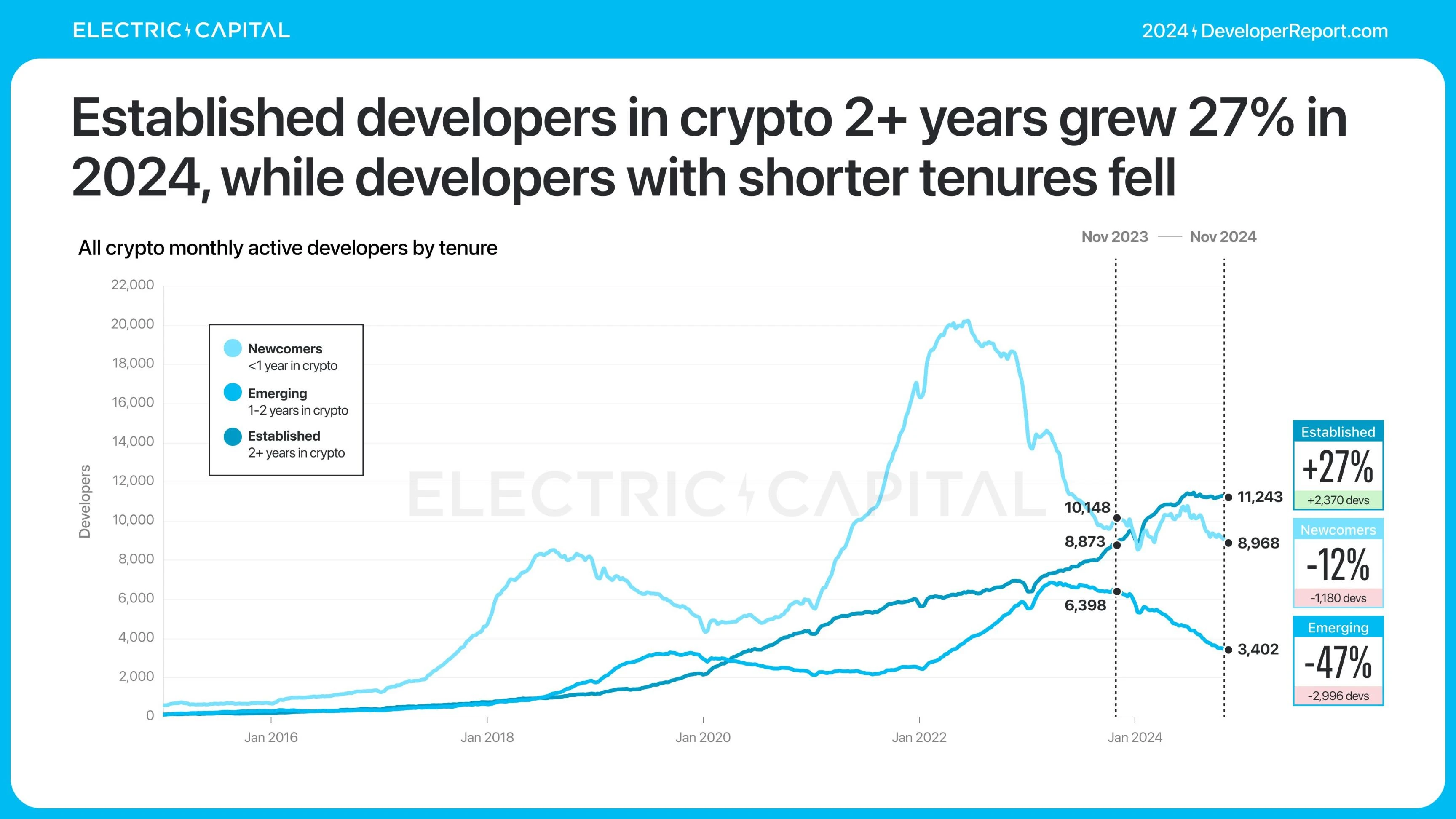 然而,从事加密行业超过两年的开发者数量增长了 27% 。