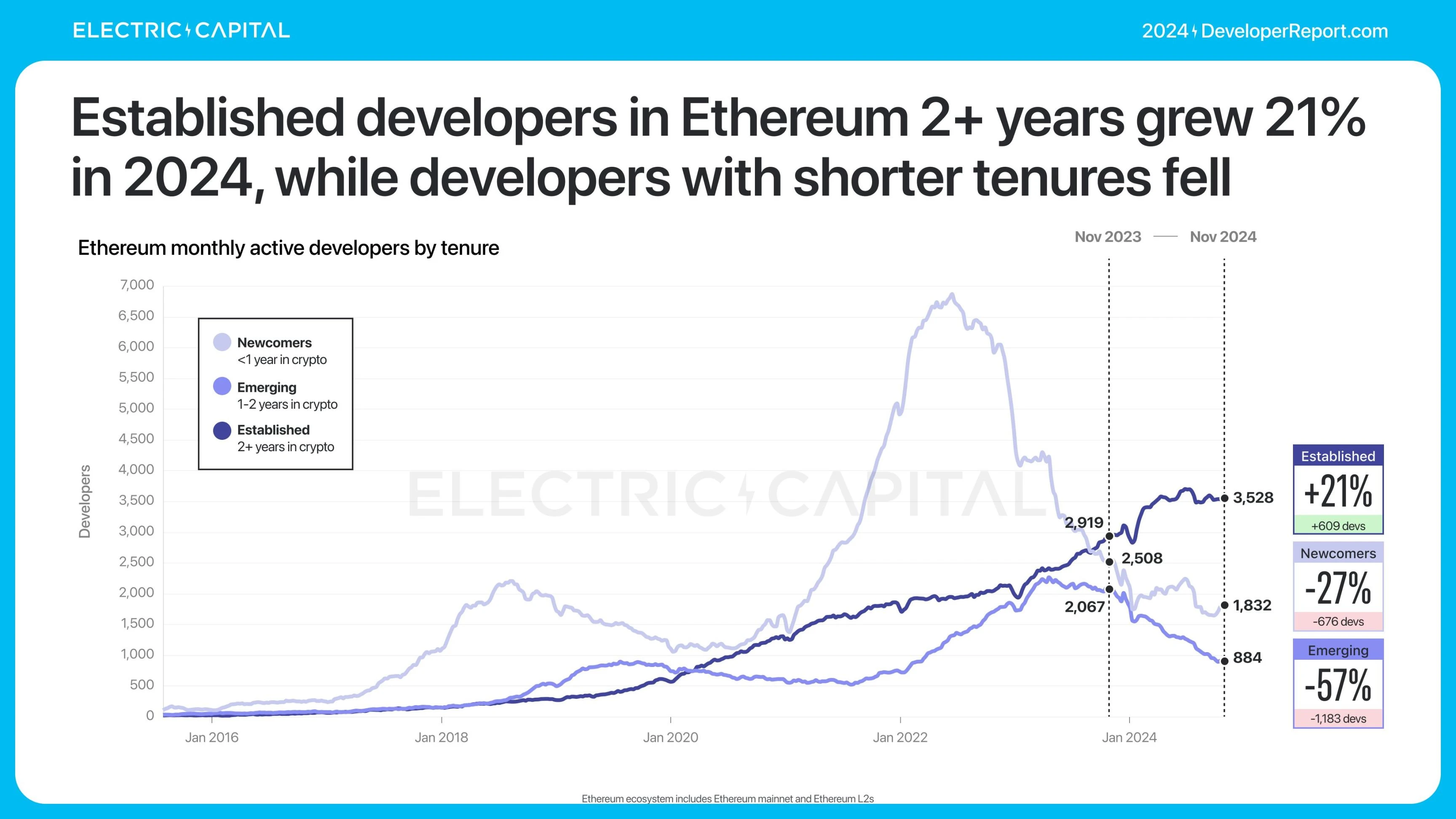 大部分损失来自于 2021 年之后加入的开发者。已经在以太坊工作的开发者中,超过 2 年的开发者增长了 21% 。