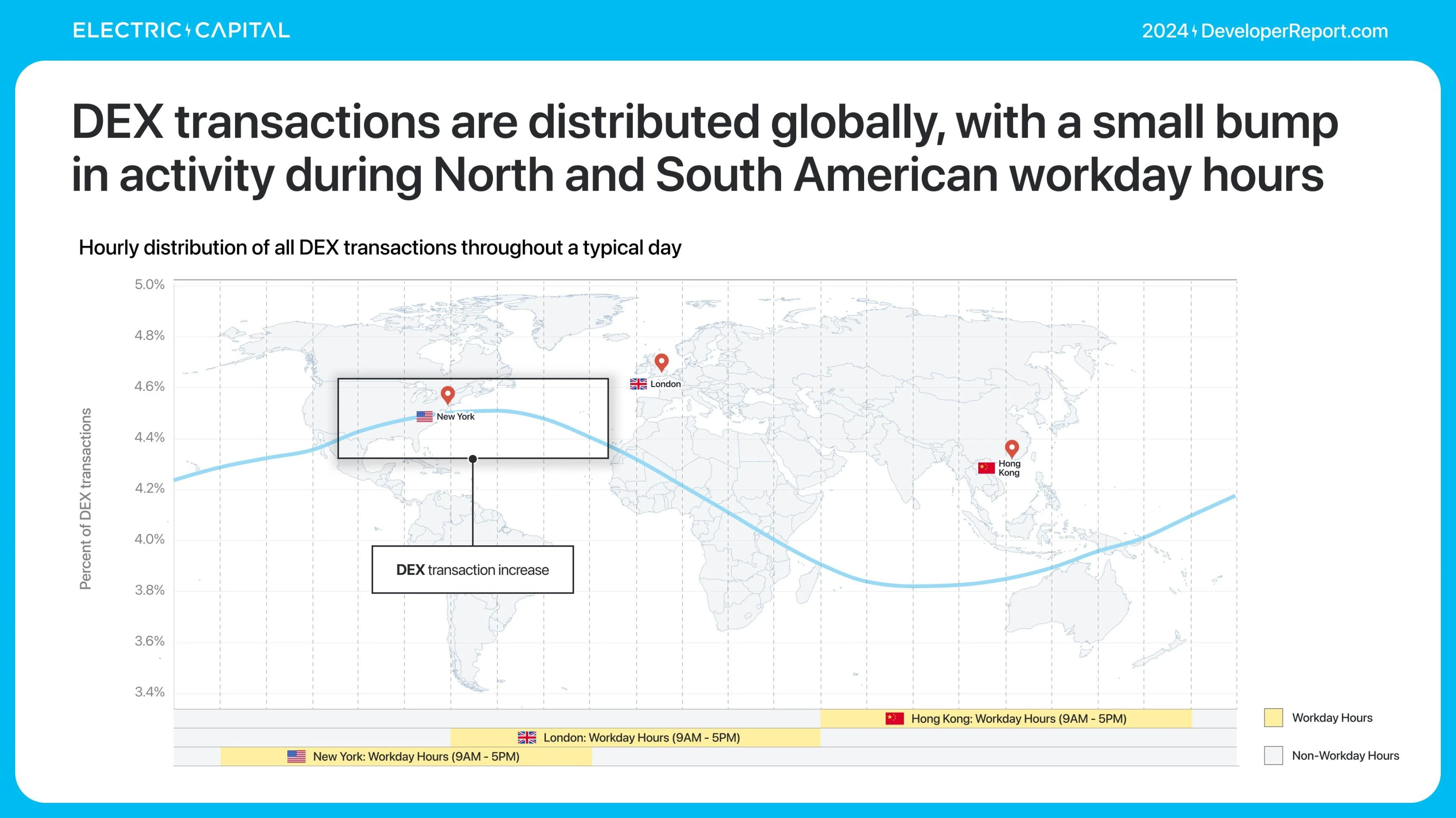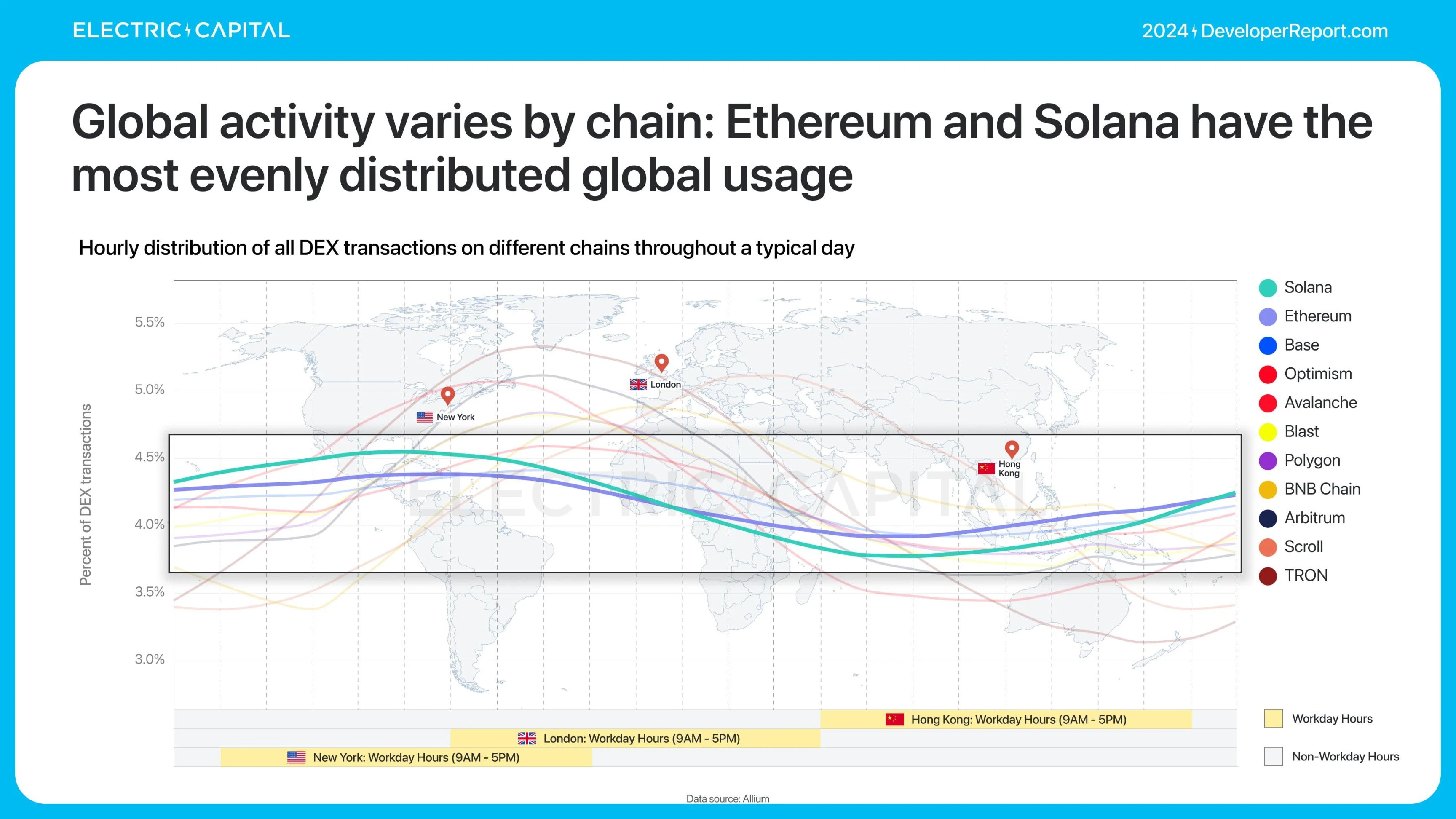 全球活动在不同链上的分布有所不同——活动分布越均匀,说明使用越具全球性。以太坊和 Solana 的使用分布最为均匀。