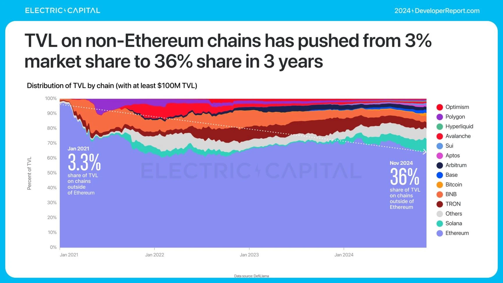 非以太坊的 TVL 在 3 年内从 3% 增长到了 36% 。