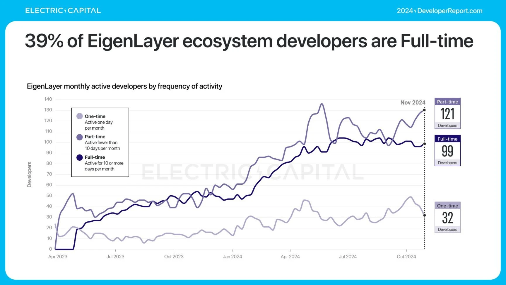 有 252 名每月活跃的开发者在 Eigenlayer 生态系统中工作。Eigenlayer 的开发者非常投入: 39% 是全职开发者,超过一半的开发者在该生态系统中工作超过 2 年。