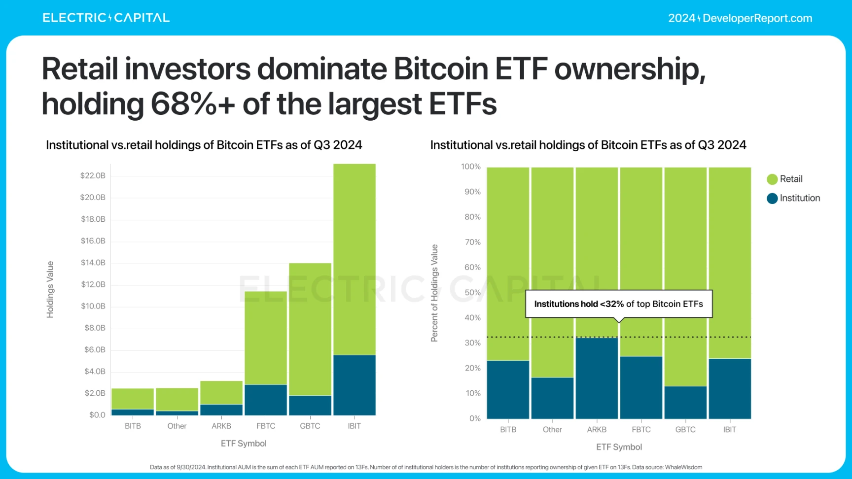 以太坊 ETF 在今年 7 月推出。目前,以太坊 ETF 的资产管理规模(AUM)为 130 亿美元,吸引了 35 亿美元的净流入。这一表现与自 2022 年以来最成功的 ETF 推出(不包括比特币 ETF)相当。这也主要由零售投资者推动。
