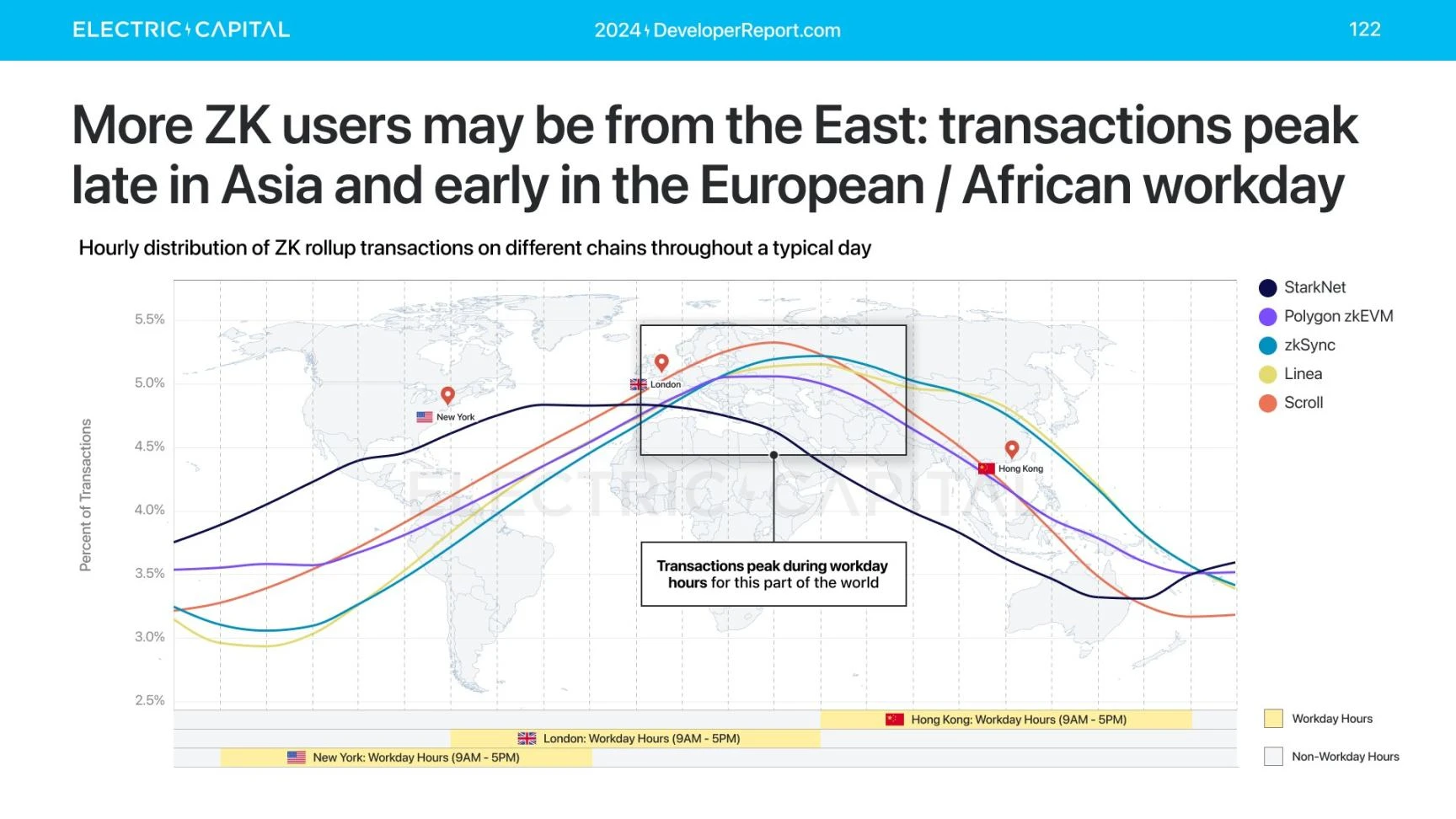ZK Rollup 合约的部署者在东半球的工作时间内活跃,ZK 用户也是如此。