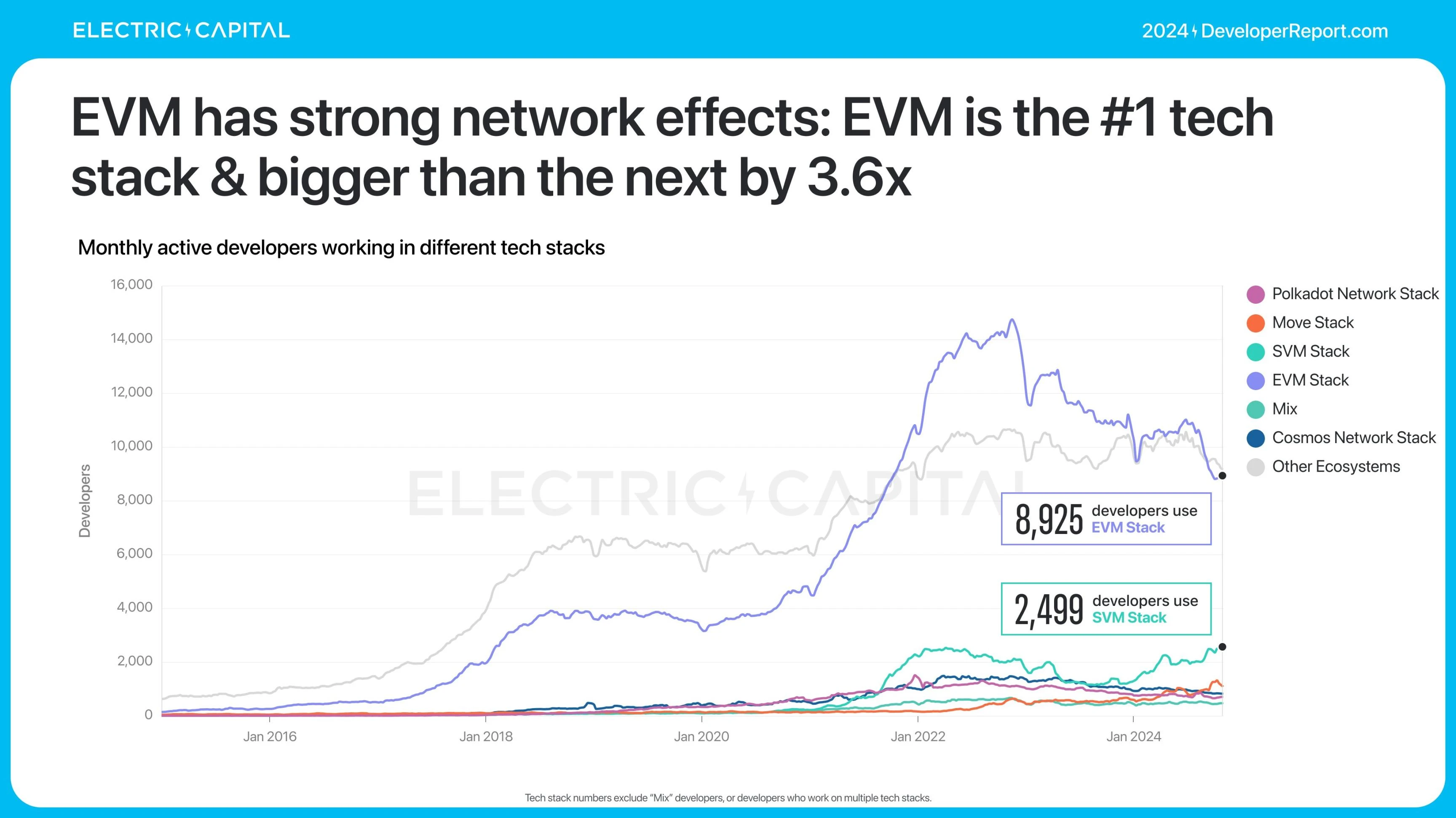 EVM 链共享了最多开发者,并且具有显著的网络效应: 74% 的多链开发者在 EVM 链上工作。