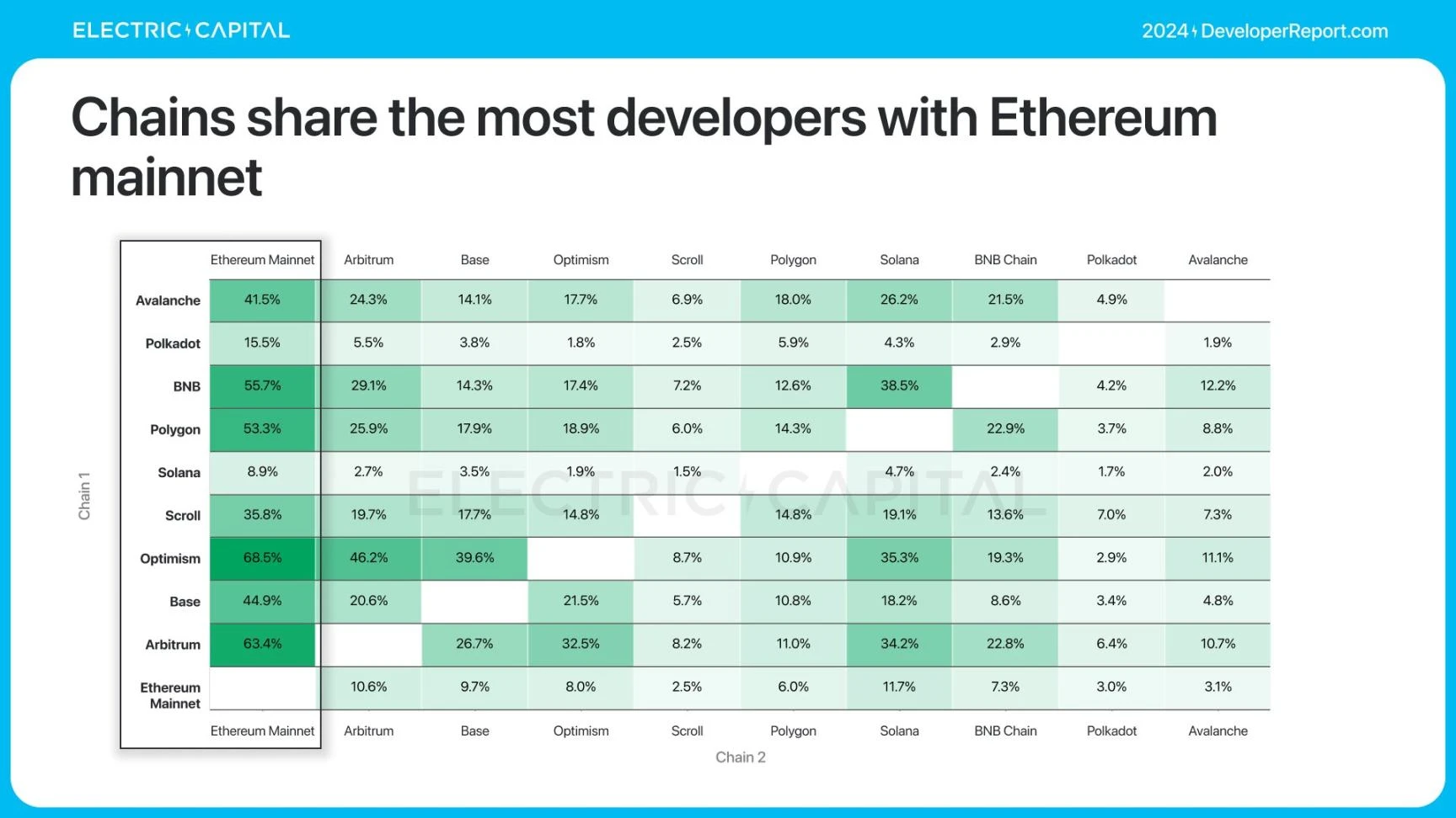 拥有最多多链开发者的链与以太坊共享开发者资源。