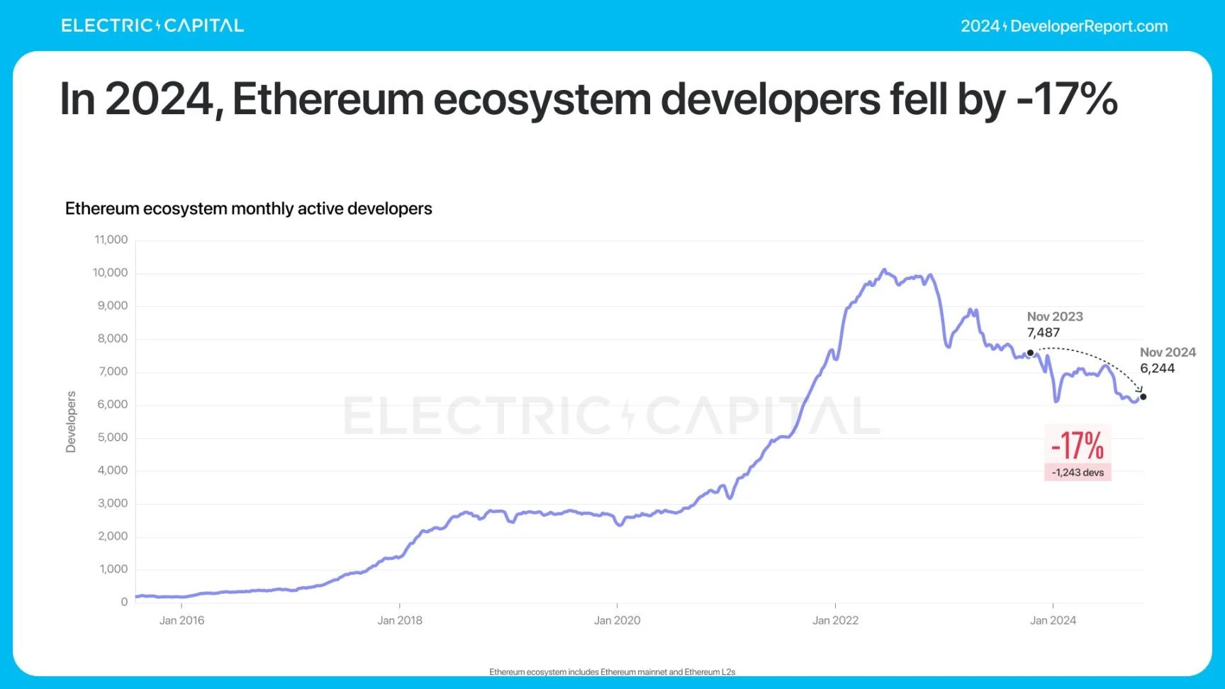 以太坊的每月活跃开发者为 6, 244 人,同比下降了 17% 。