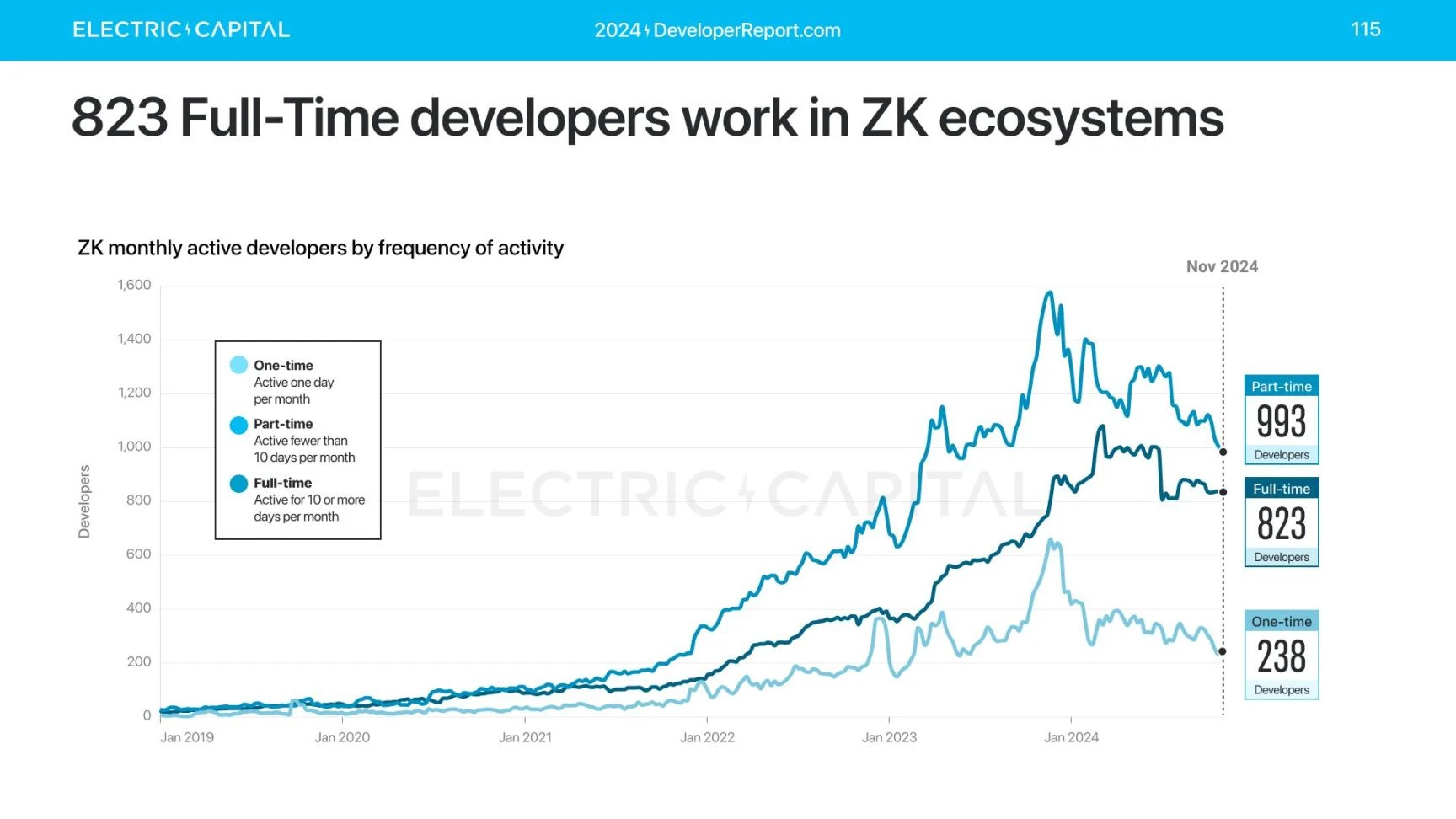 超过 2, 000 名每月活跃的开发者在 ZK 生态系统中工作,其中 823 名是全职开发者,每月提交代码超过 10 天。
