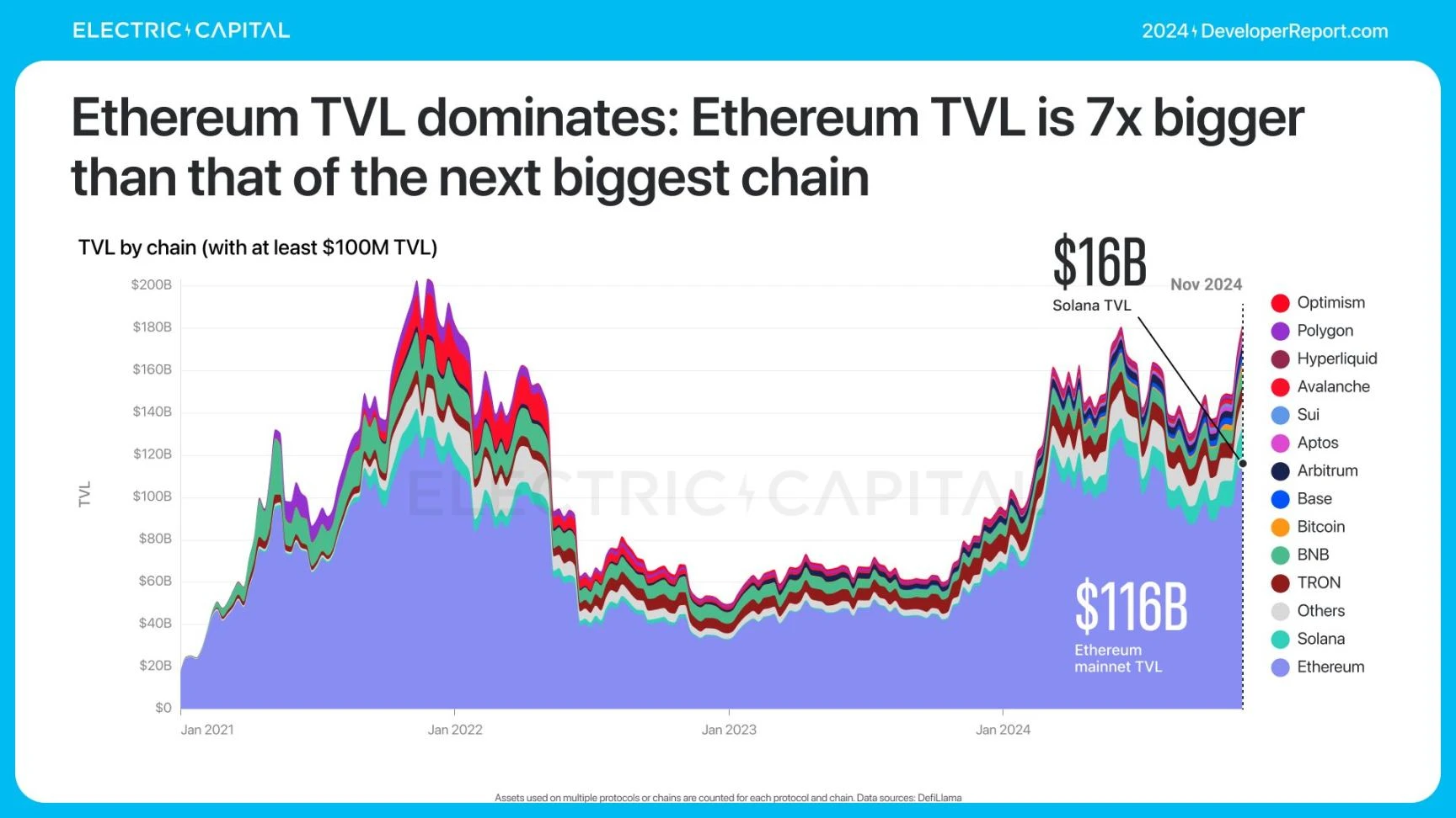 以太坊的 TVL 占据主导地位,是第二大链的 7 倍。