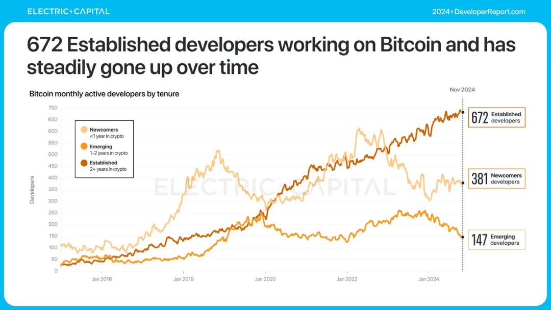 2024 年,比特币每月活跃开发者为 1, 200 人,保持稳定。有经验的比特币开发者(从事比特币开发超过 2 年的)数量稳步增长。目前,每月活跃的有经验比特币开发者达到了 672 人,创下新高。