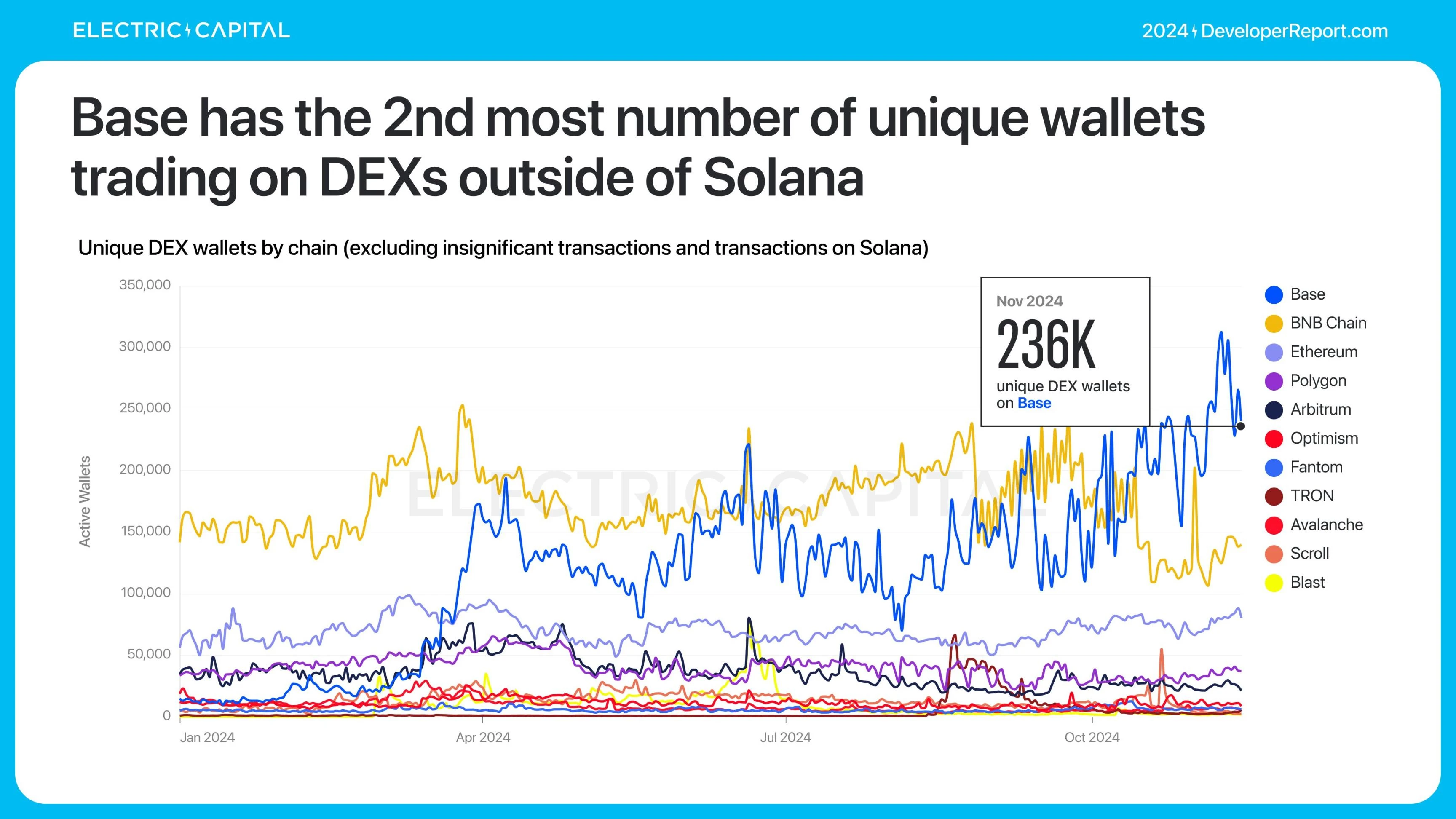 Base 在除 Solana 外,拥有第二多的独立交易钱包。