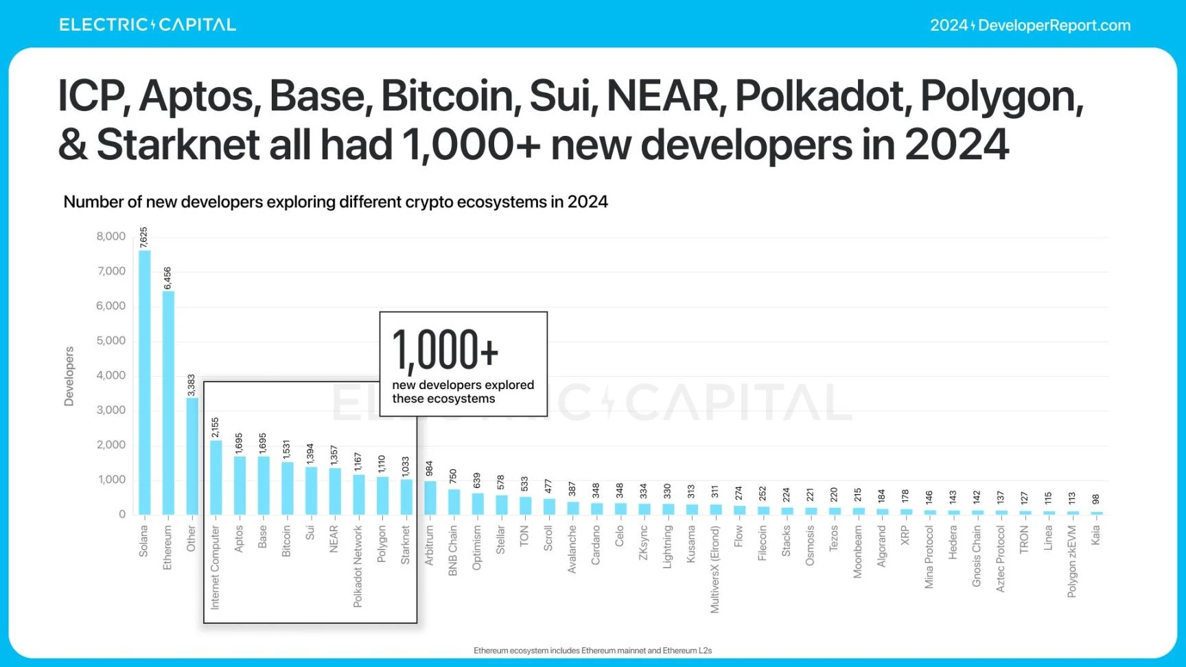 以太坊排名第二。dfinity、Aptos、Base、比特币、SuiNetwork、NEAR Protocol、Polkadot、Polygon 和 Starknet 都有超过 1, 000 位新开发者加入。