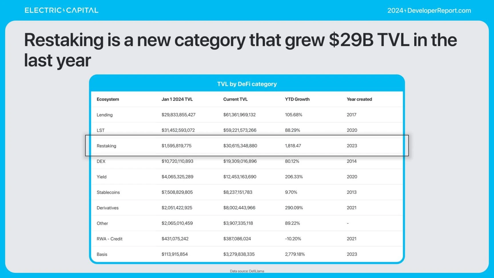 在过去一年中,再质押(Restaking)增长了 290 亿美元的 TVL。