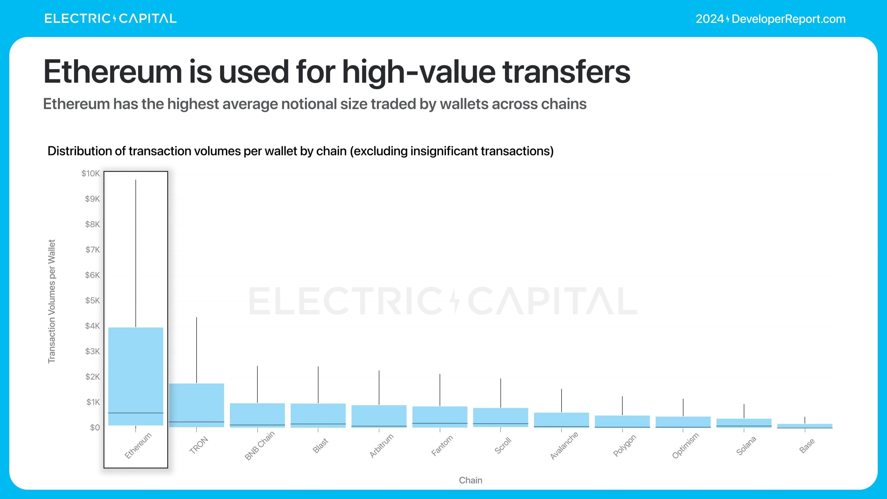 Base 和 Solana 在小额转账中非常受欢迎。这些链上的钱包交易的平均金额最小。