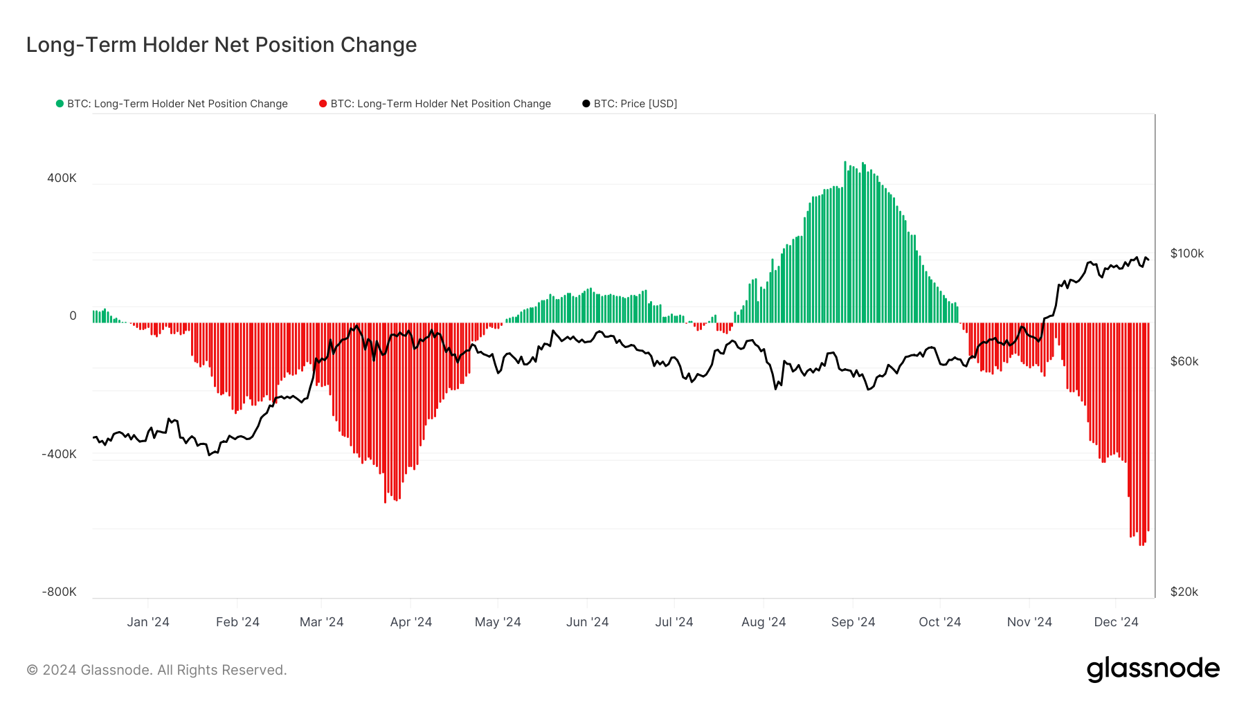 根据链上 数据 ,比特币的长期持有者净持仓量近期出现显著下降,红色条形图显示出自 10 月以来抛售压力逐步加大。尤其是在比特币价格突破新高并接近十万美金时,长期持有者的净仓位变化由正转负,表明部分投资者选择在高位进行获利了结。