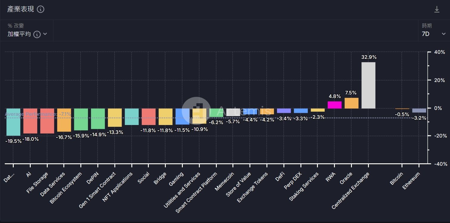 根据 Artemis 数据 显示 ,本周区块链领域板块的平均涨幅为 ( -7.1%), 其中 Centralized Exchange、Oracle 和 RWA 分别以 (32.9%、7.5%、4.8% )占据前三。
