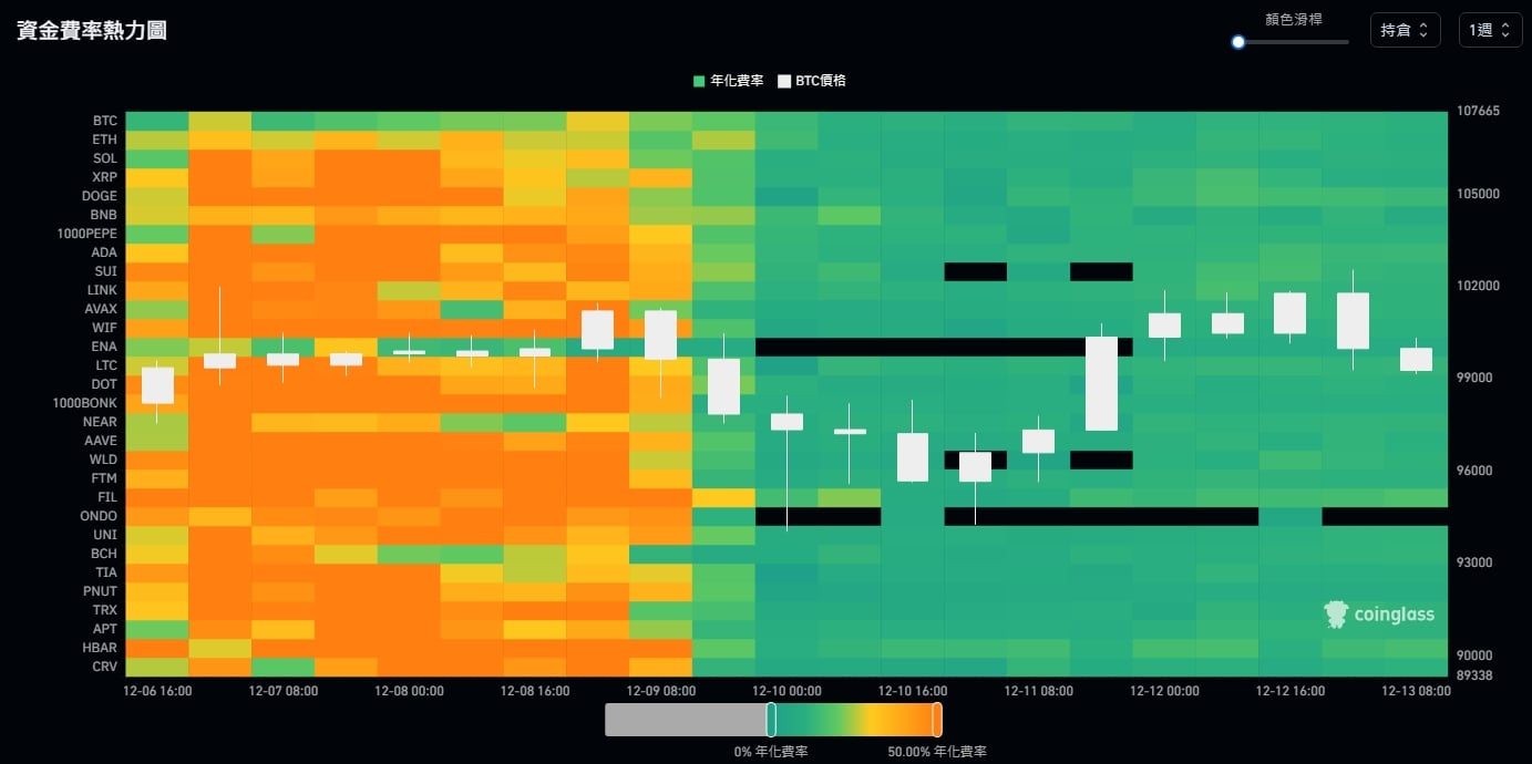 资金费率热力图 展示 了不同加密货币的资金费率变化趋势,颜色从零费率的绿色到 50% 正费率的黄色,黑色则代表负费率;白色 K 缐图则显示比特币价格波动,与资金费率形成对比。