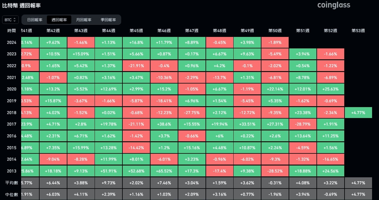 根据历史 数据 第 50 周,比特币的回报率为 -1.89% 。这一表现低于历史周平均回报率( -0.31% )和高于中位数( -1.96% ),且与前一周第 49 周的回报( +3.98% )有所差异。