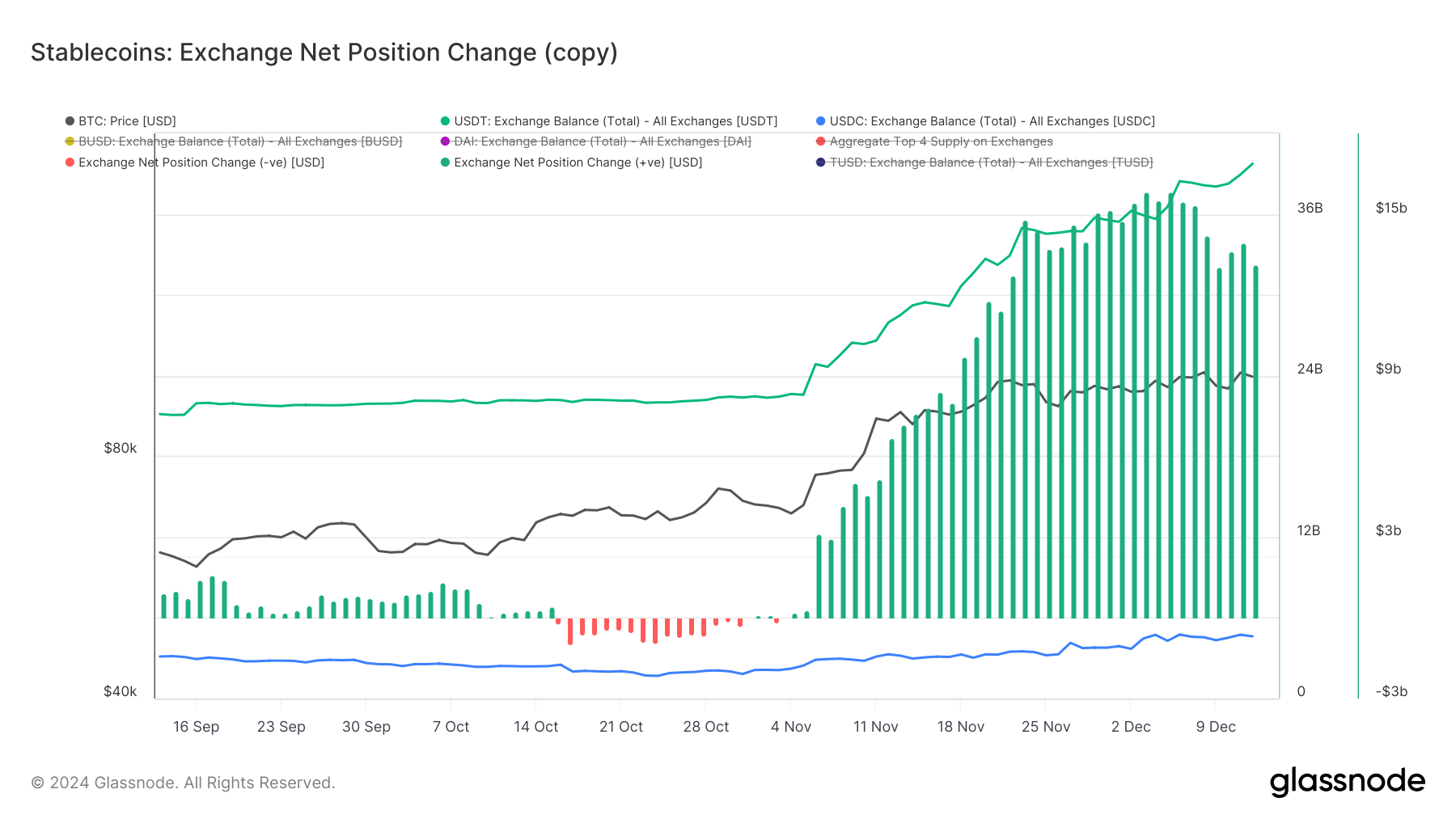 数据 显示 ,本周交易所资产呈现净流入趋势,尤以美国大选后 USDT 的大量流入为主。此现象可能是投资者为即将到来的市场波动做準备,资金流入交易所可能意味著短期内的购𧹒需求提升。