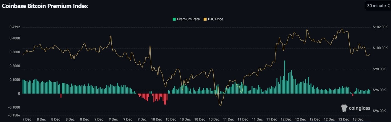 ,表明美国市场对比特币的需求仍在增强。12 月 10 日的大爆仓事件前,Coinbase 溢价指数一度为负。