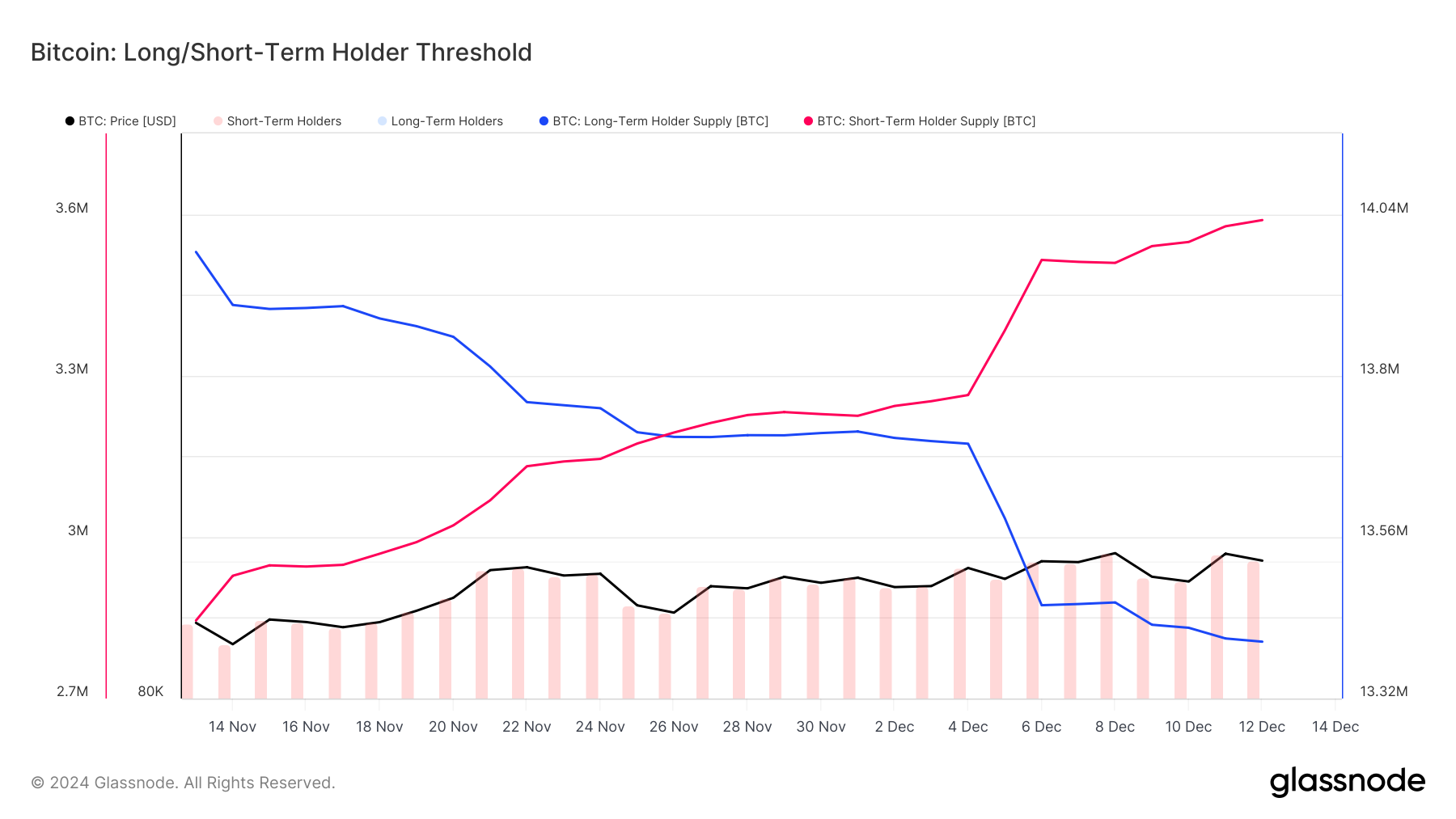 根据链上 数据 ,本周比特币的长短期持有者数据显示,随著价格上涨,短期持有者(红缐)持仓量显著增加,而长期持有者(蓝缐)持仓量则持续减少,特别是在 12 月初比特币价格多次试探十万美金大关时。