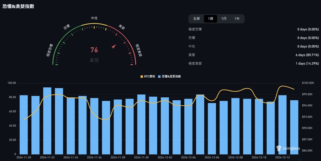 本周的市场情绪 指标 由 79 (贪婪)下降至 76 (贪婪),整周在(贪婪)与(极度贪婪)的区间。
