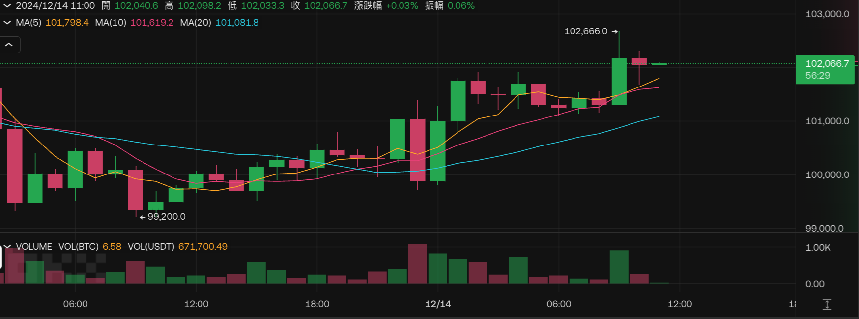 比 特币本周稍早一度快速下杀至 9.45 万美元后,周五从 99,200 美元低点稳步上行,今(14)日上午发力冲上 102,666 美元,期间涨幅近 3.5%。撰稿当下报 102,066 美元,近 24 小时上涨约 2.4%,向历史新高的 104,000 美元关卡发起挑𢧐。