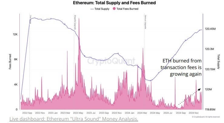 另一方面是,以太坊的总供应量已达到 1.2 亿枚 ETH,这是自 2023 年 4 月以来的最高水準。而透过交易费用销毁的 ETH 数量已从 8 月份的日均 80 ETH 成长至超过 2,700 ETH。