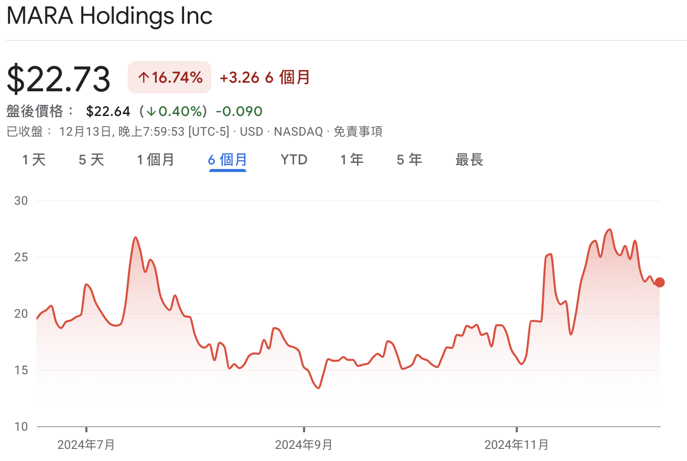 根据 Google Finance 最新数据显示 ,在过去半年内,MARA 股价上涨 16.74%,表现出不俗的成长潜力。然而,对比 MicroStrategy 市值已逼近 980 亿美元的规模,MARA 在资本市场的地位仍有较大差距。