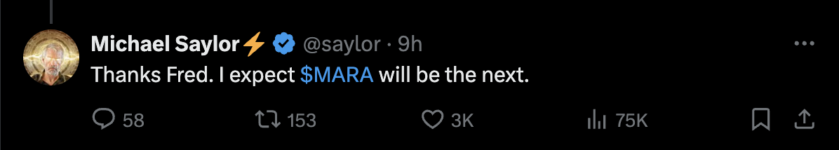 同时,微策略共同创办人兼执行主席 Michael Saylor 在 X 平台发文表示,他预期比特币矿企 MARA(Marathon Digital Holdings) 将成为下一个被纳入纳斯达克 100 的公司。