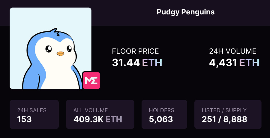 据数据显示,目前 Pudgy Penguins 地板价突破 31 ETH,再创新历史新高,若以 ETH 价格截稿暂报为 3,890 美元来计算,一个 Pudgy Penguins 的 NFT 达到了 12.2 万美元。