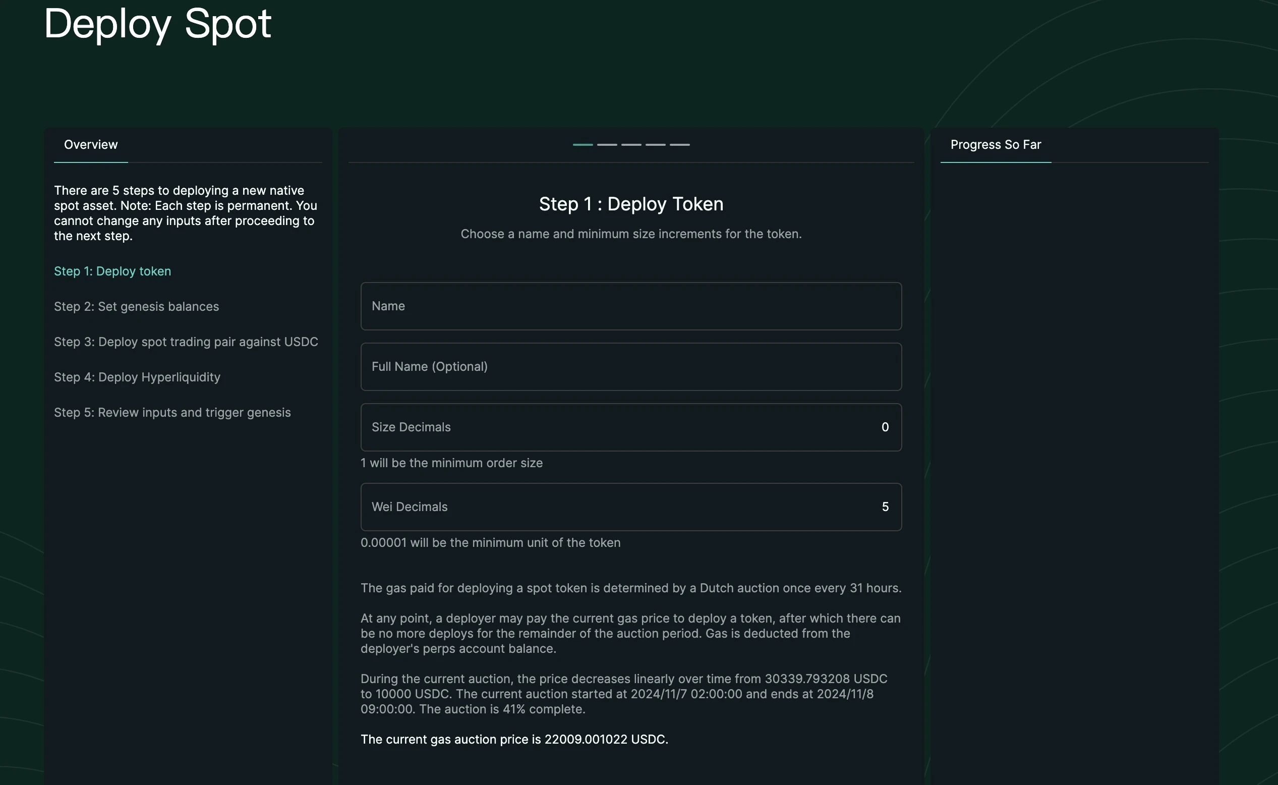 而 Hyperliquid 的上币流程为持续 31 小时的荷兰拍 ,在此期间,代币部署费用会从初始价格线性下降至 10000 美元稳定币(USDC),直至有代币拍下即上线 Hyperliquid 现货市场。 如果最后一次拍卖失败,初始价格将恢复到 10000 美元稳定币,否则拍卖的起始价格将是上一次价格的两倍。