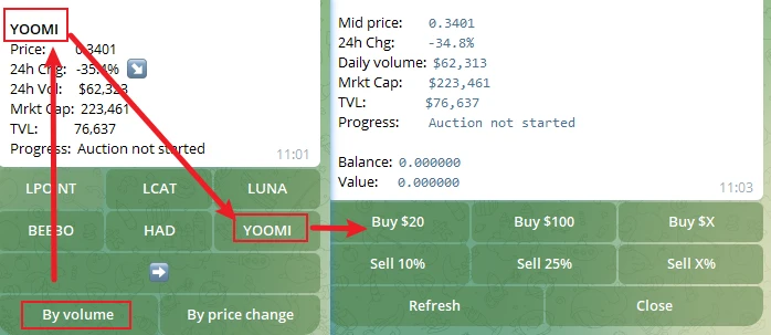 另一种方式为通过 Telegram 主页的“/launches”(可选交易量或价格排序)或者“/chat”两个方式进行购买,前者为官方数据筛选工具,点击后直接选择购买数量。后者为公开聊天频道,能够在其中发现热门代币,同样通过点击跳转的方式进行交易。